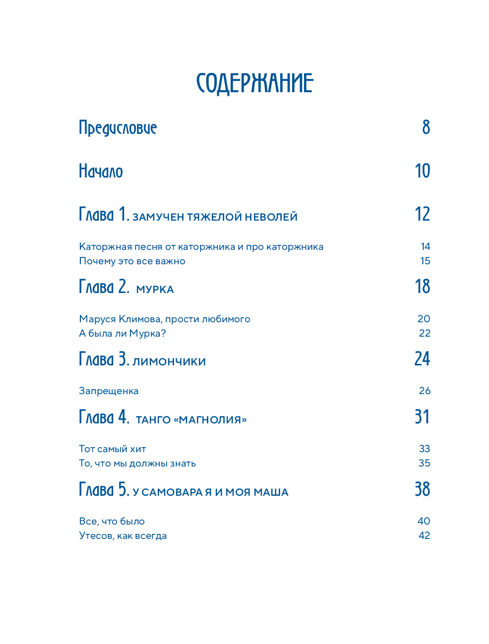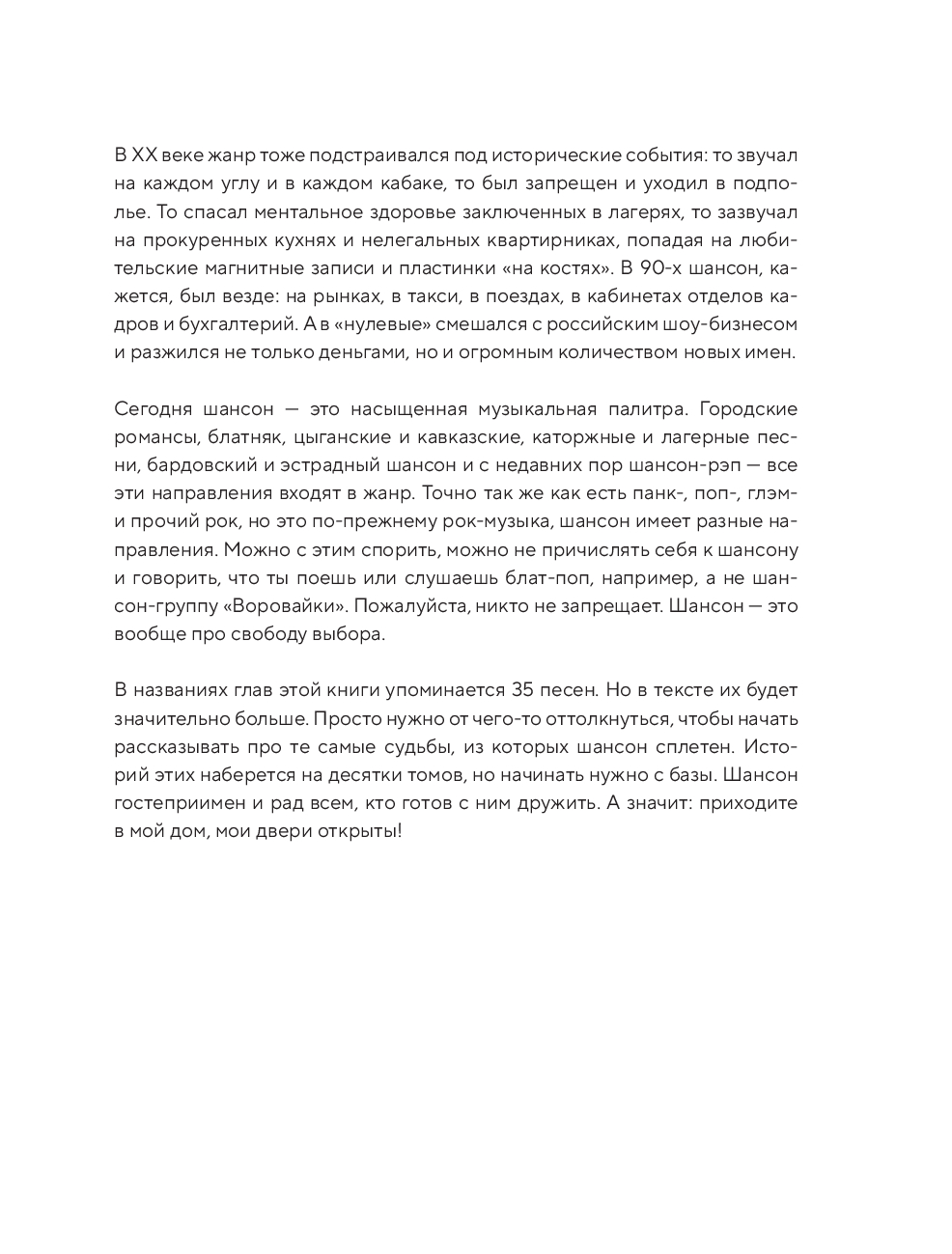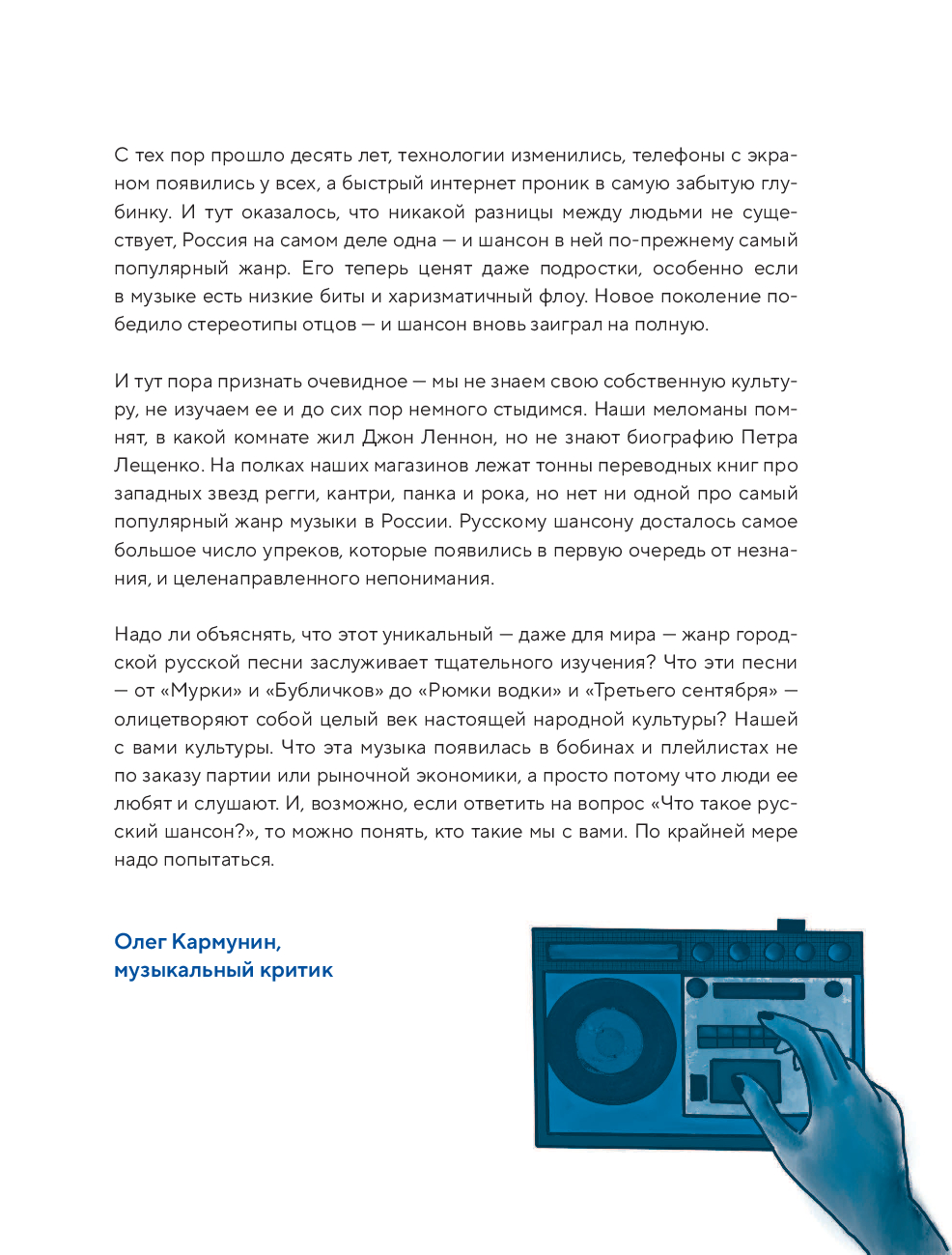 Внутри своей книги культуролог, исследователь шансона и автор канала "Чифирнуть бы, ништяк!" Наталия Хомякова разбирает жанр на примере 35 культовых песен: от Михаила Круга и группы "Бутырка" до Стаса Михайлова и "Каспийского Груза". Коллекция нетленных хитов собрана внутри первого большого исследования шансона, написанного в жанре нон-фикшн.