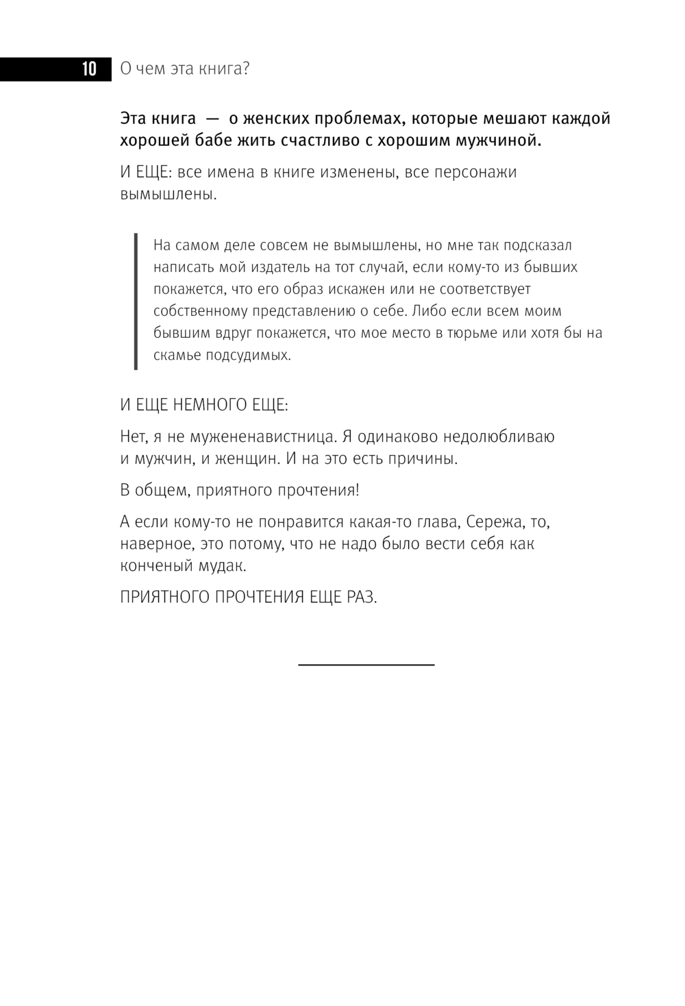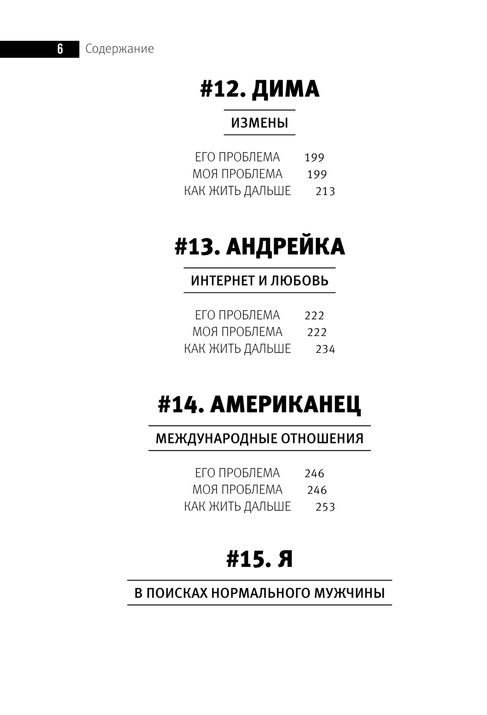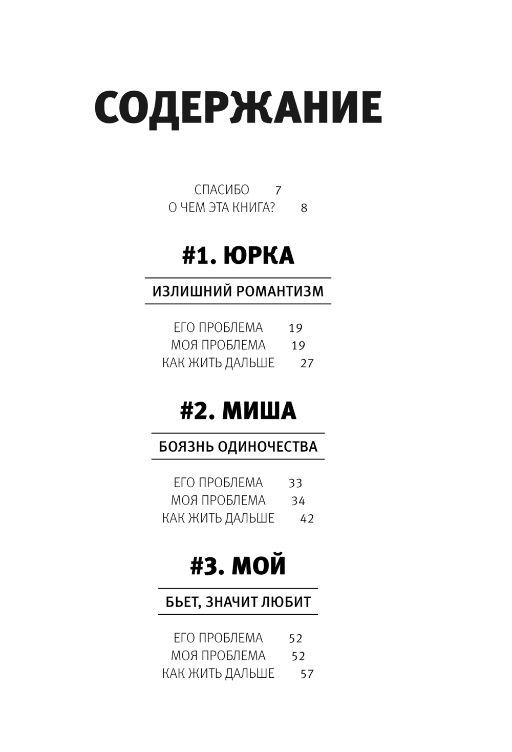 В книге рассказывается о типажах мужчин и особенностях отношений с ними, а также о женских проблемах, которые мешают им быть счастливыми: излишний романтизм, боязнь одиночества, рукоприкладство, неравные, свободные и международные отношения, ревность, дружба между мужчиной и женщиной, отношения с женатым, секс из жалости, идеализация замужества, измены, онлайн-любовь и поиски нормального мужчины. И это далеко не полный список тем, которые писательница поднимает в гиде по сильному полу...