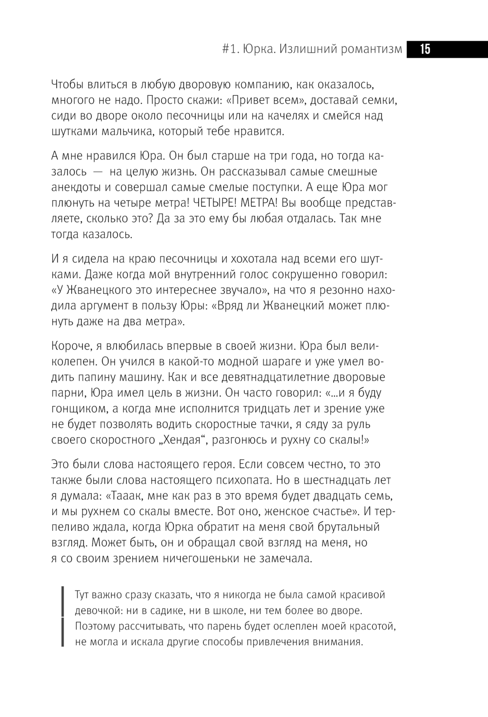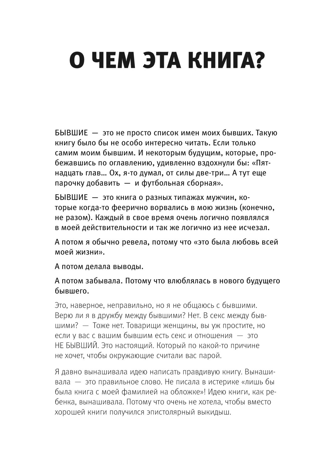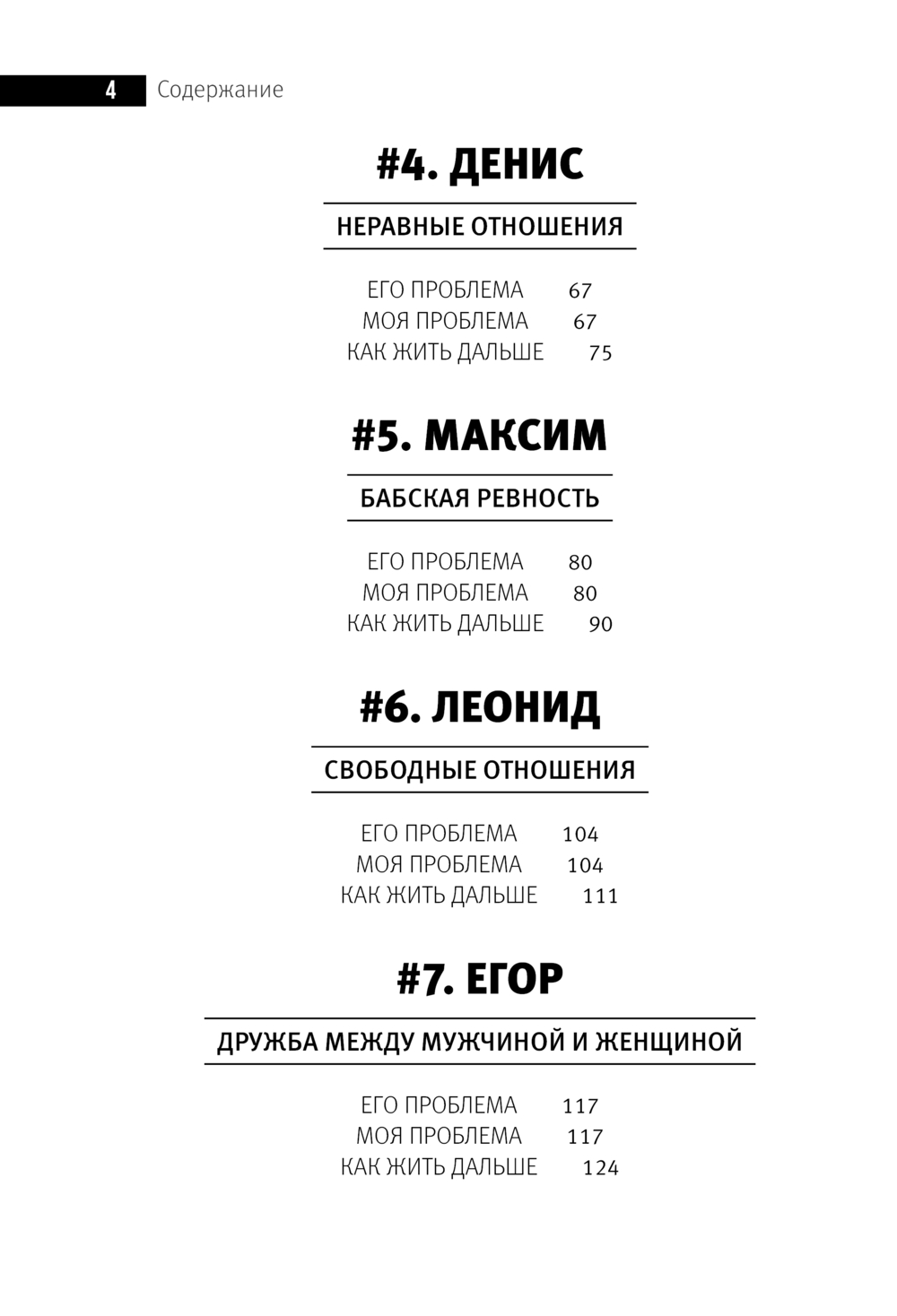 В книге рассказывается о типажах мужчин и особенностях отношений с ними, а также о женских проблемах, которые мешают им быть счастливыми: излишний романтизм, боязнь одиночества, рукоприкладство, неравные, свободные и международные отношения, ревность, дружба между мужчиной и женщиной, отношения с женатым, секс из жалости, идеализация замужества, измены, онлайн-любовь и поиски нормального мужчины. И это далеко не полный список тем, которые писательница поднимает в гиде по сильному полу...