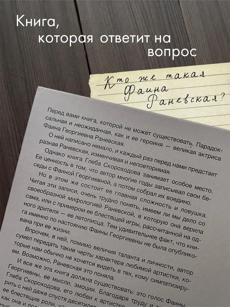 И все же эта книга должна существовать: это голос Фаины Георгиевны, ее мысли, эмоции. Благодаря труду и терпению Глеба Скороходова, его любви к артистке мы можем поговорить с ней даже спустя десятилетия после ее ухода, вспомнить ее блестящие роли, узнать о жизни, надеждах, мечтах, о том, как она и подобные ей люди – настоящие Мастера, влюбленные в свое дело – творили великое искусство, которым мы по праву гордимся.