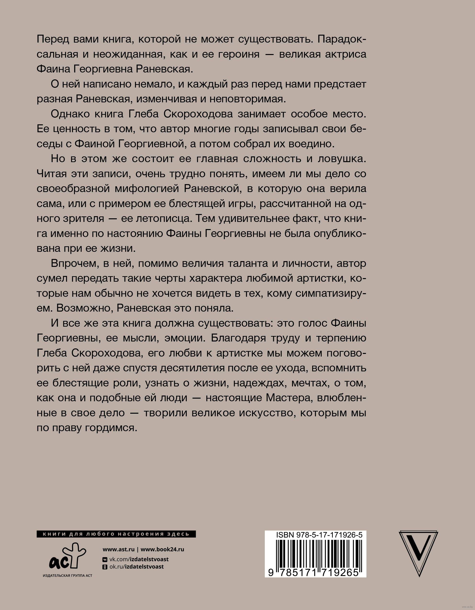 Однако книга Глеба Скороходова занимает особое место. Ее ценность в том, что автор многие годы записывал свои беседы с Фаиной Георгиевной, а потом собрал их воедино.