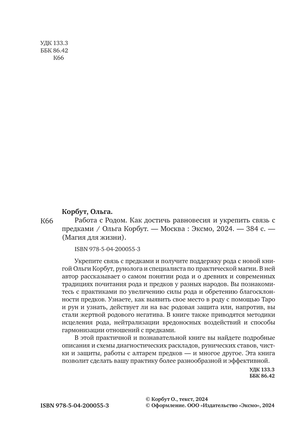 Укрепите связь с предками и получите поддержку рода с новой книгой Ольги Корбут, рунолога и специалиста по практической магии. Помните: у всех нас есть любящие предки, которые хотят, чтобы мы жили счастливо, выполнили свое предназначение и прославили род. Поддерживая и укрепляя связь со своими предками, вы никогда не будете одиноки или покинуты, ведь мудрость ваших предков всегда остается с вами.