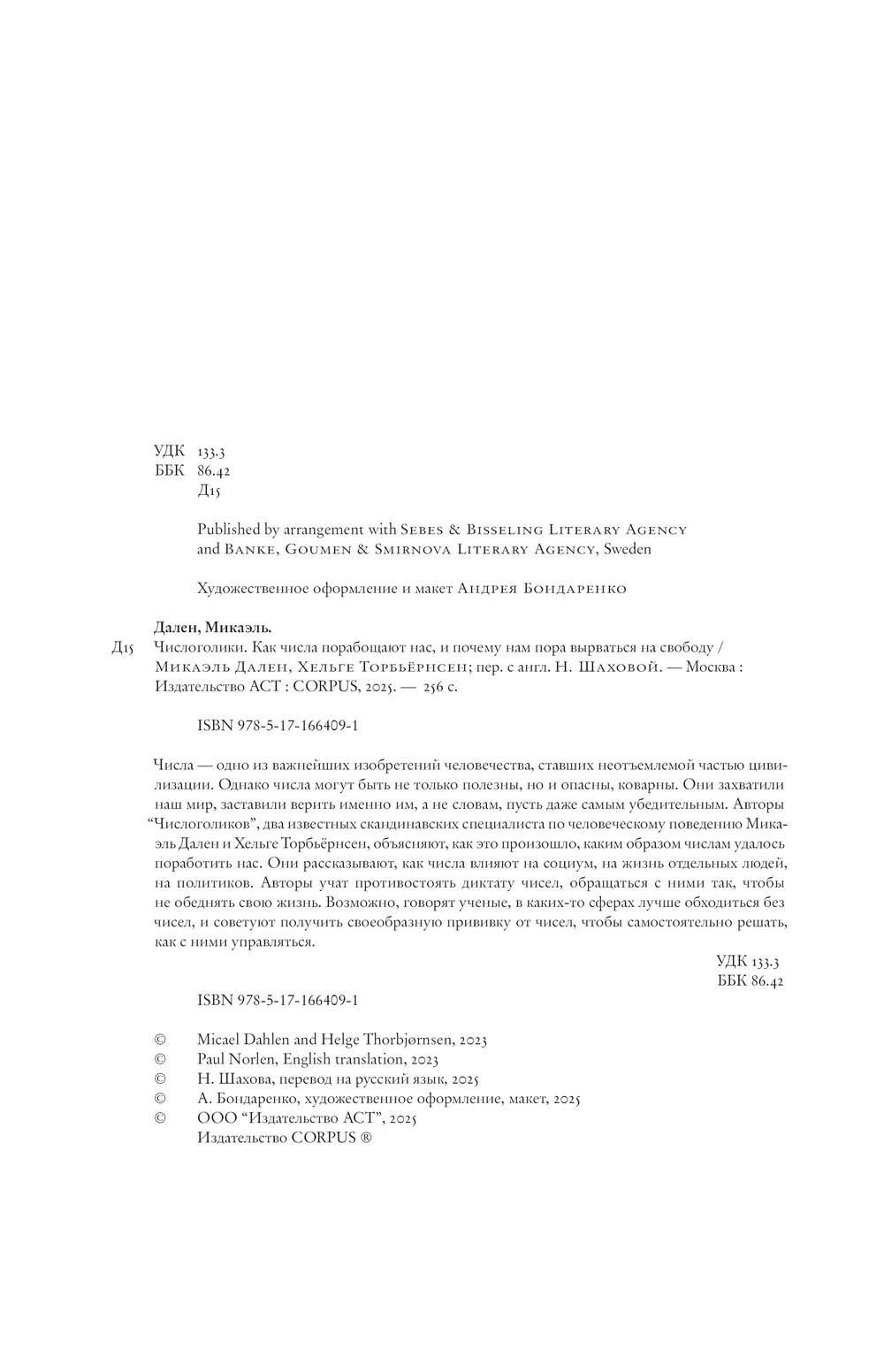 Числа – одно из важнейших изобретений человечества, ставших неотъемлемой частью цивилизации. Однако числа могут быть не только полезны, но и опасны, коварны. Они захватили наш мир, заставили верить именно им, а не словам, пусть даже самым убедительным. Авторы "Числоголиков", два известных скандинавских специалиста по человеческому поведению Микаэль Дален и Хельге Торбьёрнсен, объясняют, как это произошло, каким образом числам удалось поработить нас. Они рассказывают, как числа влияют на социум, на жизнь отдельных людей, на политиков. Авторы учат противостоять диктату чисел, обращаться с ними так, чтобы не обеднять свою жизнь. Возможно, говорят ученые, в каких‑то сферах лучше обходиться без чисел, и советуют получить своеобразную прививку от чисел, чтобы самостоятельно решать, как с ними управляться.