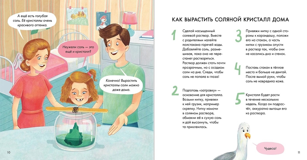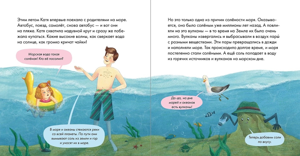 Катя с родителями впервые отдыхает на море. Какое же оно огромное, синее и... солёное! Кто же его посолил? Родители расскажут Кате, что такое соль и откуда она берётся, какой бывает, чем полезна для нашего организма и почему, при всей пользе, с солью в еде лучше не перебарщивать. Катя также узнает, как соль используют в кулинарии, чем её можно заменить при приготовлении блюд, и даже о том, как вырастить настоящий кристалл соли у себя дома. А ещё научится готовить полезные и вкусные блюда – с солью и без неё.