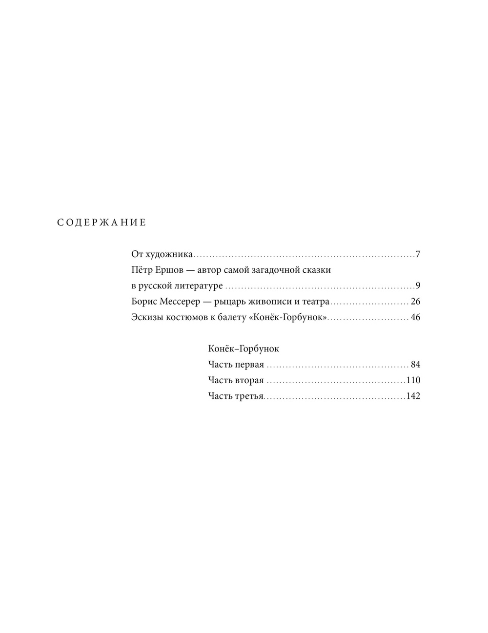 В этом издании как в волшебной шкатулке сокрыты красивые рисунки и музыка, и удивительная тайна. Борис Мессерер создал эскизы для балета "Конёк-Горбунок" на музыку Родиона Щедрина, и, может быть даже незаметно для самого художника, в его рисунках ожили персонажи, те, кого придумал Пётр Ершов полтора столетия назад. И Конёк, и рыбы-ерши, и Жар-птица, не говоря уж об обаятельном лукавом Иване, оказались и волшебными и настоящими. Но это еще не вся тайна этой книги – она скрыта не только в иллюстрациях, но в тексте, и как найти ее – объясняют замечательные специалисты – филолог Ирина Минералова и искусствовед, театральный критик Дмитрий Родионов.
