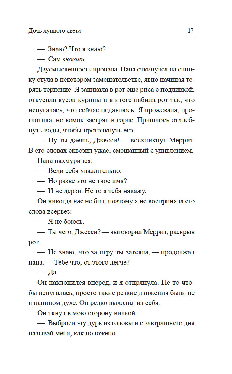 Шестнадцатилетняя Джесси Сассер живет в округе Уилкс, Северная Каролина, который издавна славится изготовлением и продажей самогона. "Лунный свет" – так называют этот напиток, потому что гнать его приходится лунными ночами, скрываясь от правительственных агентов. Мать у Джесси погибла при взрыве перегонного куба, поэтому девушка презирает и ненавидит своего отца, для которого "семейное дело", похоже, важнее всего на свете. Романтика тайных троп, хитроумные способы ухода от погони, легкие деньги – все это ей совершенно чуждо. Но когда с отцом случается беда, Джесси поневоле приходится переосмыслить свои жизненные принципы. И лишь тогда перед ней открывается страшная семейная тайна, которую так долго от нее скрывали.