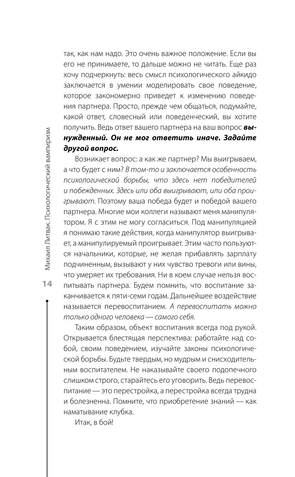 Михаил Литвак на реальных примерах из жизни раскрывает механизмы, с помощью которых люди используют других для получения эмоциональной энергии и поддержки. В книге приведены практические советы и стратегии для защиты от таких манипуляторов, а также методы работы над собой, которые помогут развить внутреннюю силу и уверенность, осознать свои границы и укрепить психику.
