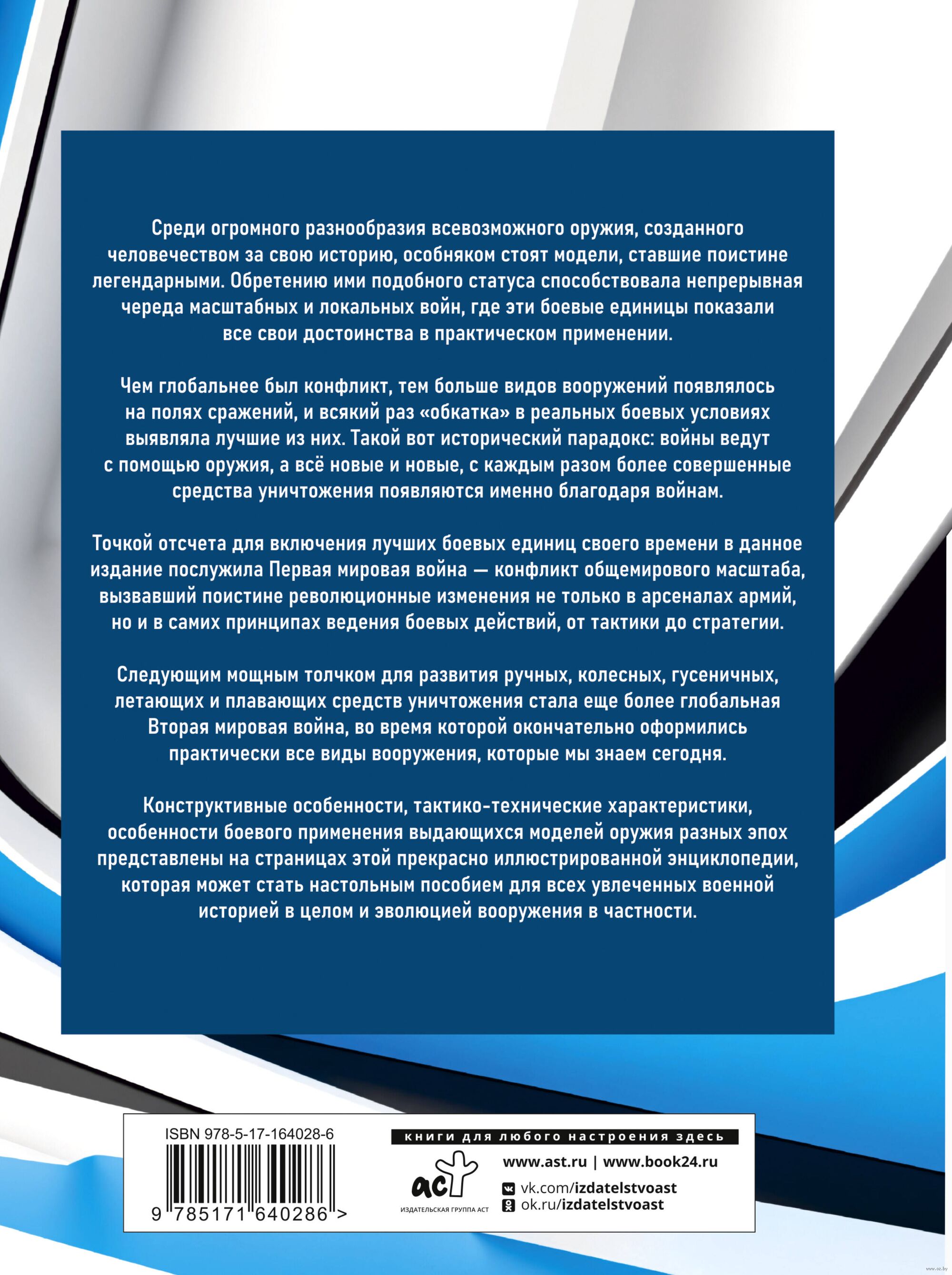 Каждая из легендарных моделей, включенных в данное издание, на практике доказала свою непревзойденную боевую эффективность и надежность. Достаточно сказать, что некоторые из этих боевых единиц, разработанные более столетия назад, благодаря удачной конструкции и высоким эксплуатационным качествам выпускаются и используются в наши дни. Эволюцию всех классов вооружений здесь можно проследить по хронологическим диаграммам в начале каждого раздела, а благодаря достоверным иллюстрациям, архивным фотоснимкам и содержательным описаниям – получить представление о том, как выглядели и, главное, работали в боевых условиях самые совершенные модели оружия. Для тех, кто всерьез интересуется историческим и современным вооружением, представлены его тактико-технические характеристики, указываются предприятия-изготовители и годы постановки на вооружение.