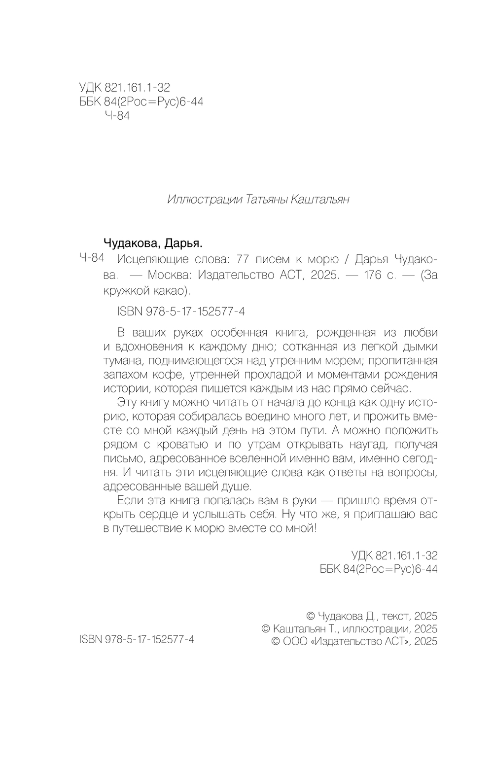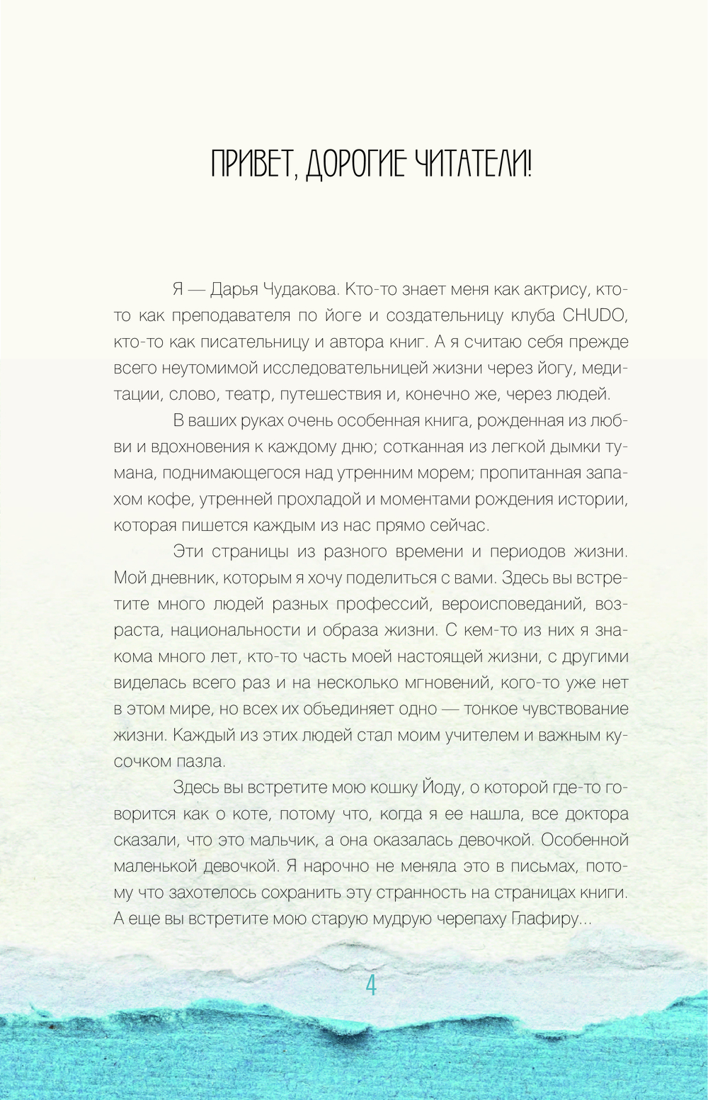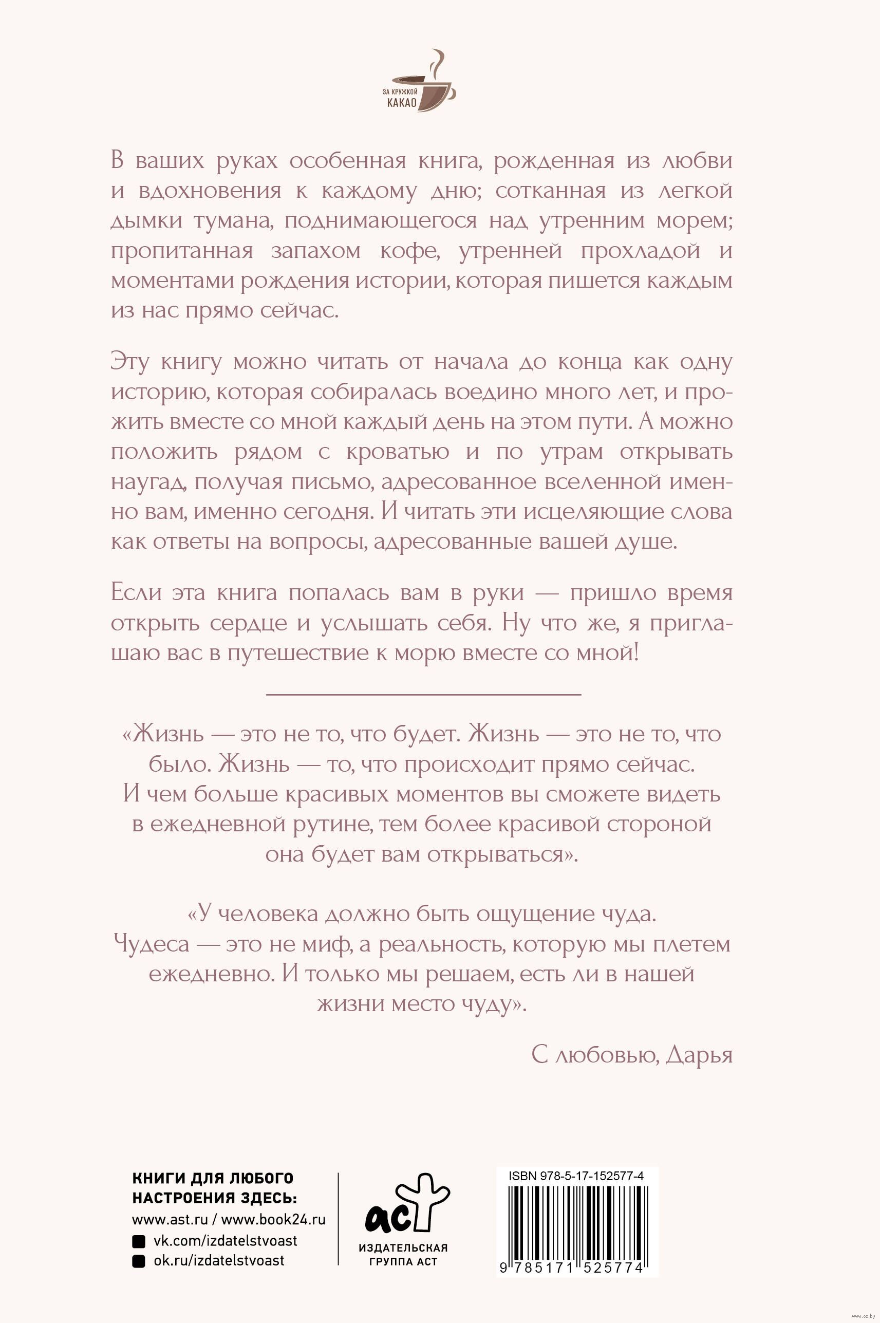 В ваших руках особенная книга, рожденная из любви и вдохновения к каждому дню; сотканная из легкой дымки тумана, поднимающегося над утренним морем; пропитанная запахом кофе, утренней прохладой и моментами рождения истории, которая пишется каждым из нас прямо сейчас.