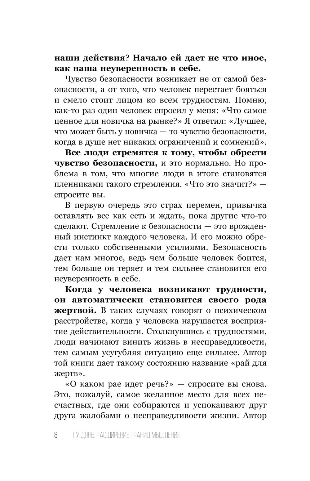В книге "Расширение границ мышления" Гу Дянь рассматривает вопросы неуверенности в себе, уклонения от ответственности, а также самоконтроля как ключа к выходу из некоторых наших ловушек сознания.