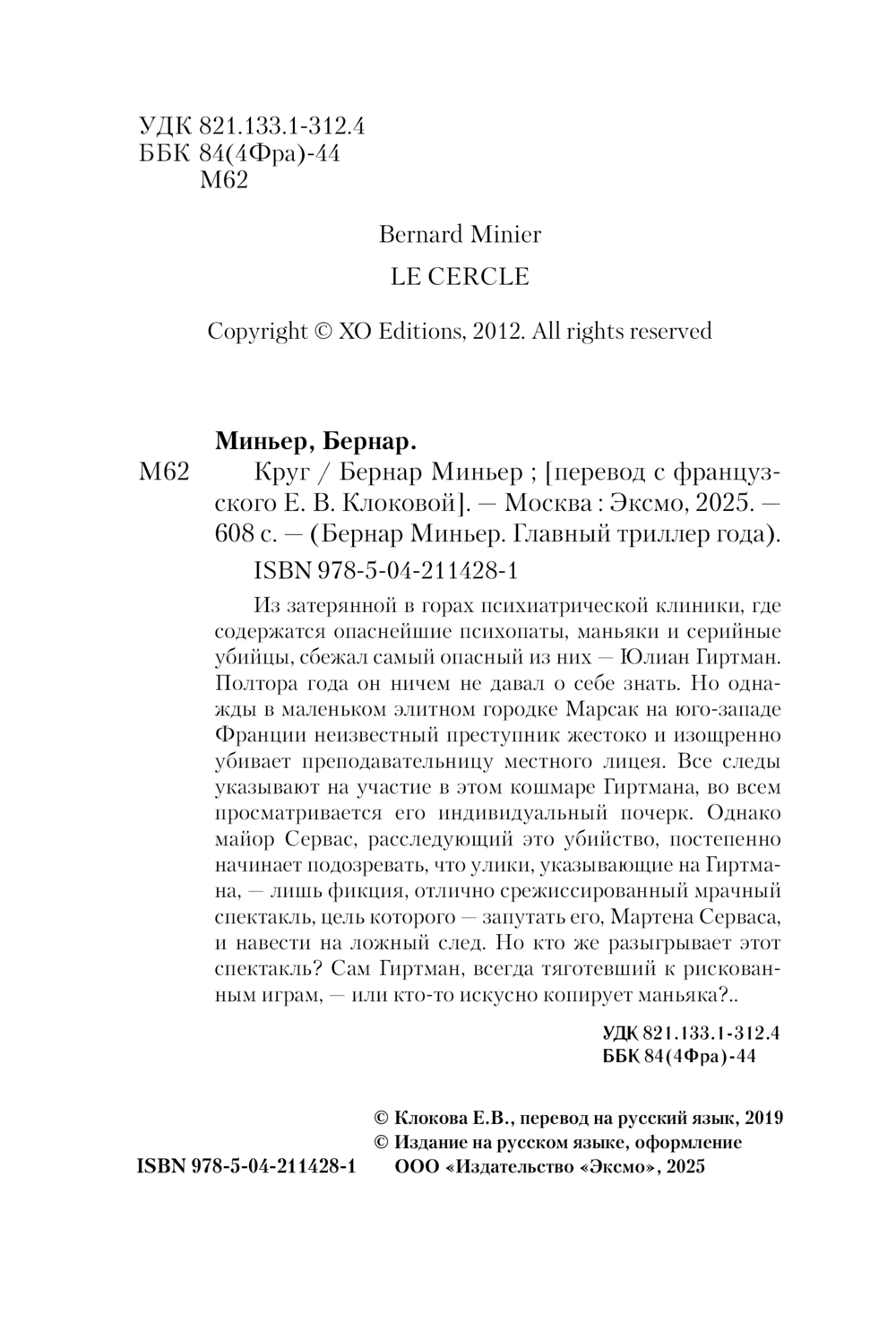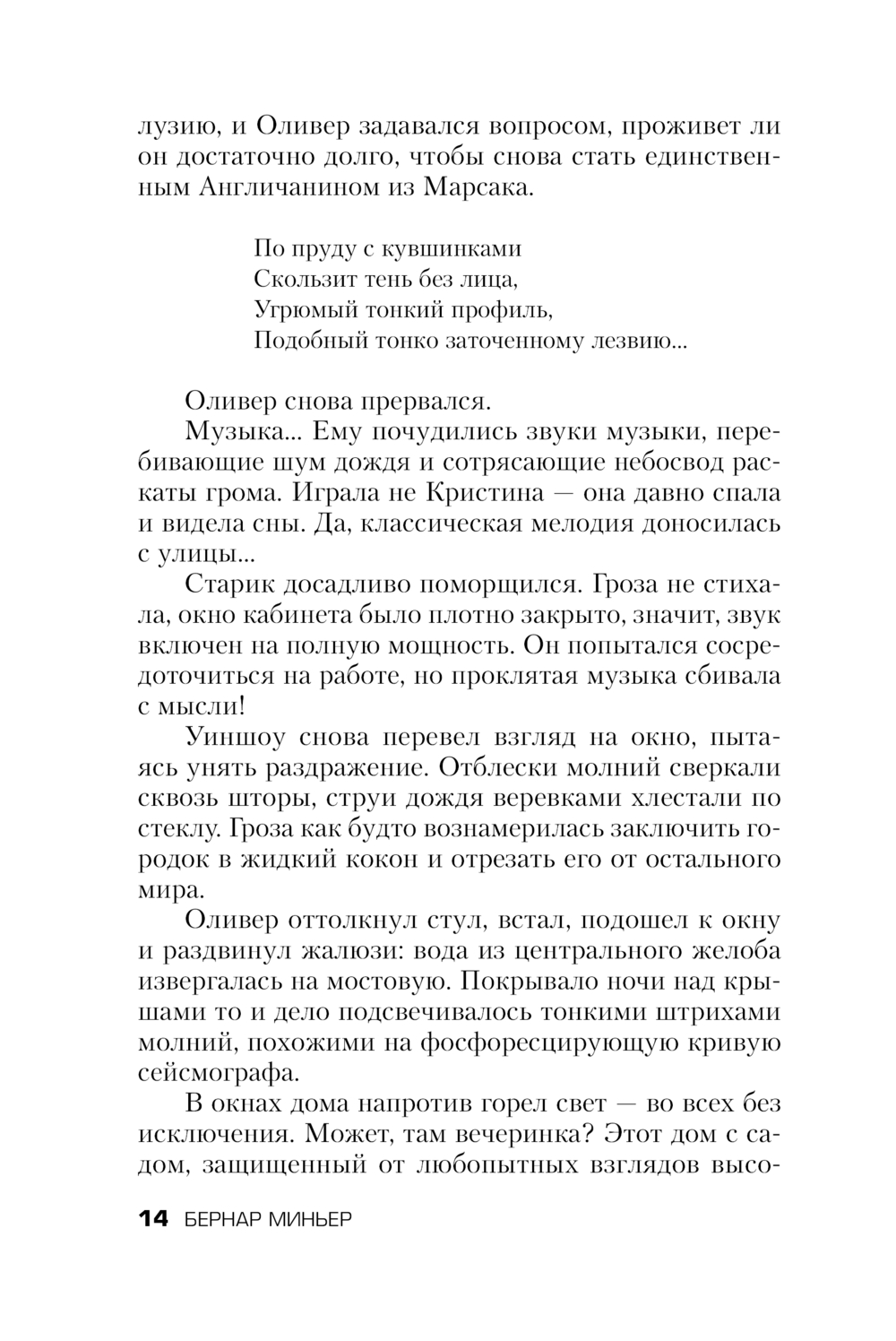 Из затерянной в горах психиатрической клиники, где содержатся опаснейшие психопаты, маньяки и серийные убийцы, сбежал самый опасный из них – Юлиан Гиртман. Полтора года он ничем не давал о себе знать. Но однажды в маленьком элитном городке Марсак на юго-западе Франции неизвестный преступник жестоко и изощренно убивает преподавательницу местного лицея. Все следы указывают на участие в этом кошмаре Гиртмана, во всем просматривается его индивидуальный почерк. Однако майор Сервас, расследующий это убийство, постепенно начинает подозревать, что улики, указывающие на Гиртмана, – лишь фикция, отлично срежиссированный мрачный спектакль, цель которого – запутать его, Мартена Серваса, и навести на ложный след. Но кто же разыгрывает этот спектакль? Сам Гиртман, всегда тяготевший к рискованным играм, – или кто-то искусно копирует маньяка?..
