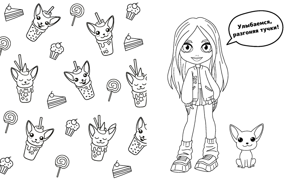 В этой раскраске ты найдёшь окрашительные арты, творческие задания и набор ярких наклеек!