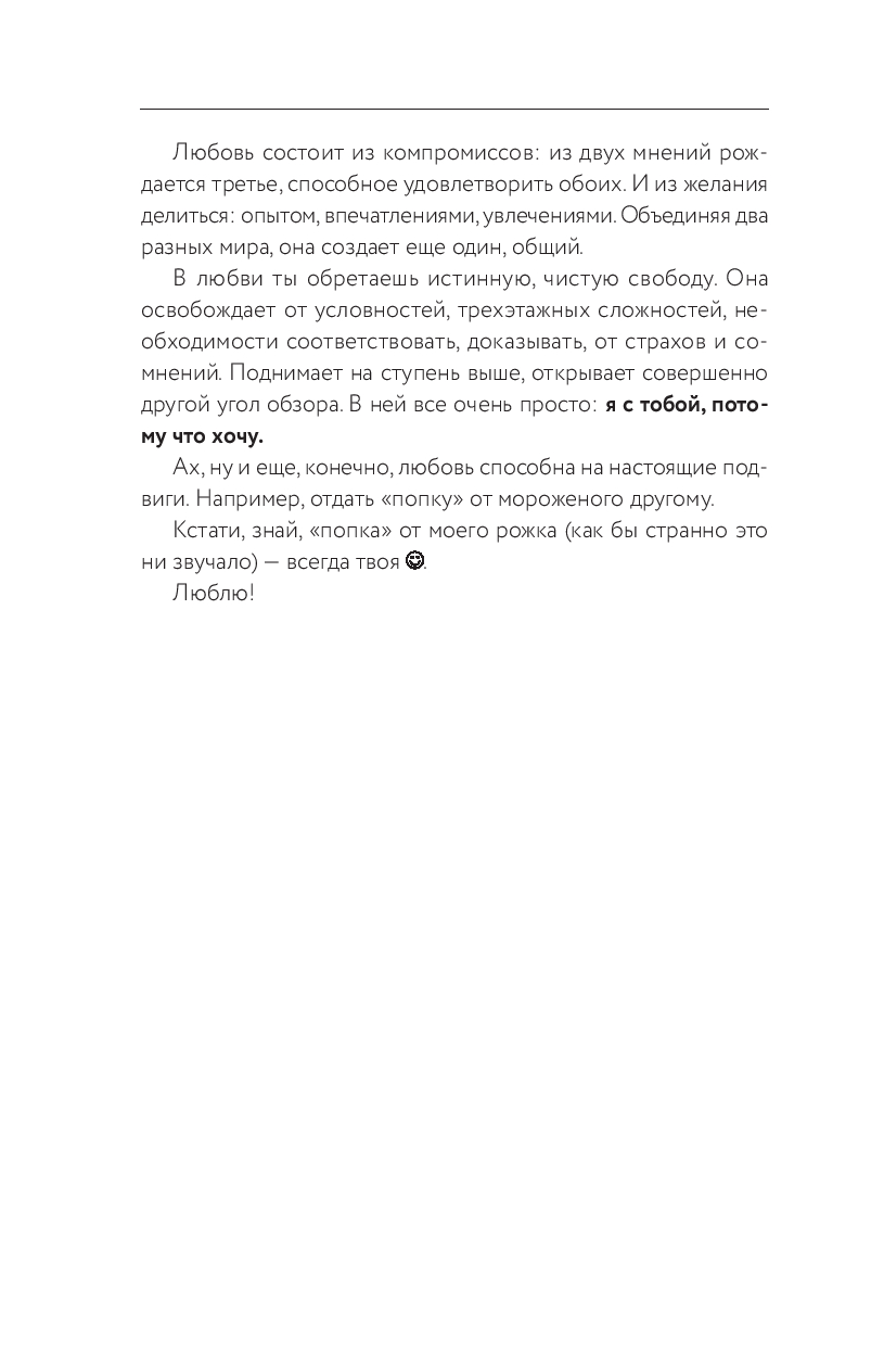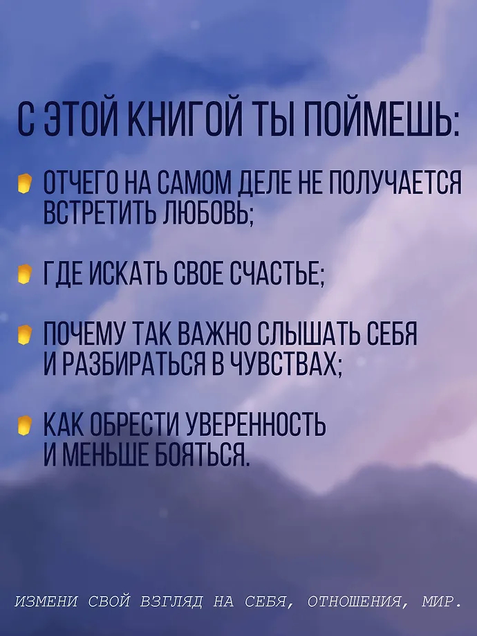 "Дорогой мой человек, эти рассказы и письма – не просто чтение, а терапия. Они помогут тебе понять, как встретить свою счастливую любовь; услышать себя; разобраться в чувствах; обрести уверенность; меньше бояться; изменить взгляд на себя, отношения, мир".
