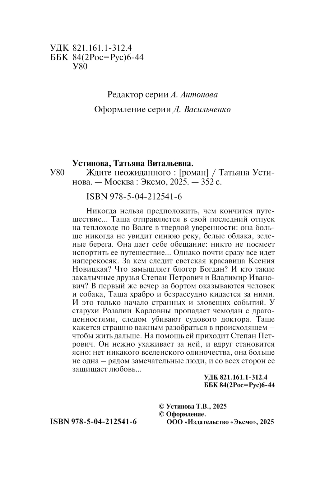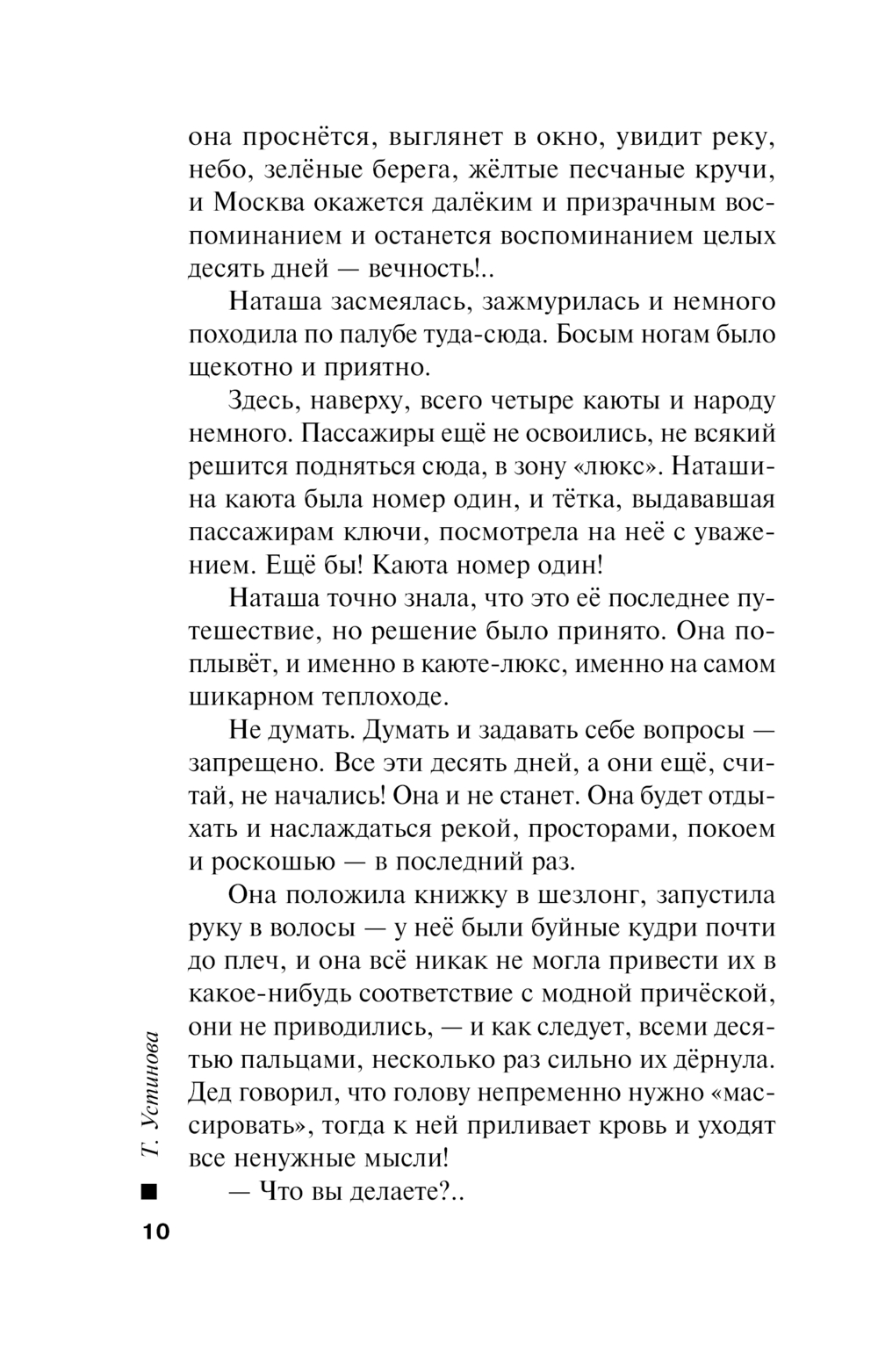 Никогда нельзя предположить, чем кончится путешествие... Таша отправляется в свой последний отпуск на теплоходе по Волге в твердой уверенности: она больше никогда не увидит синюю реку, белые облака, зеленые берега. Она дает себе обещание: никто не посмеет испортить ее путешествие... Однако почти сразу все идет наперекосяк. За кем следит светская красавица Ксения Новицкая? Что замышляет блогер Богдан? И кто такие закадычные друзья Степан Петрович и Владимир Иванович? В первый же вечер за бортом оказываются человек и собака, Таша храбро и безрассудно кидается за ними. И это только начало странных и зловещих событий. У старухи Розалии Карловны пропадает чемодан с драгоценностями, следом убивают судового доктора. Таше кажется страшно важным разобраться в происходящем – чтобы жить дальше. На помощь ей приходит Степан Петрович. Он нежно ухаживает за ней, и вдруг становится ясно: нет никакого вселенского одиночества, она больше не одна – рядом замечательные люди, и со всех сторон ее защищает любовь...