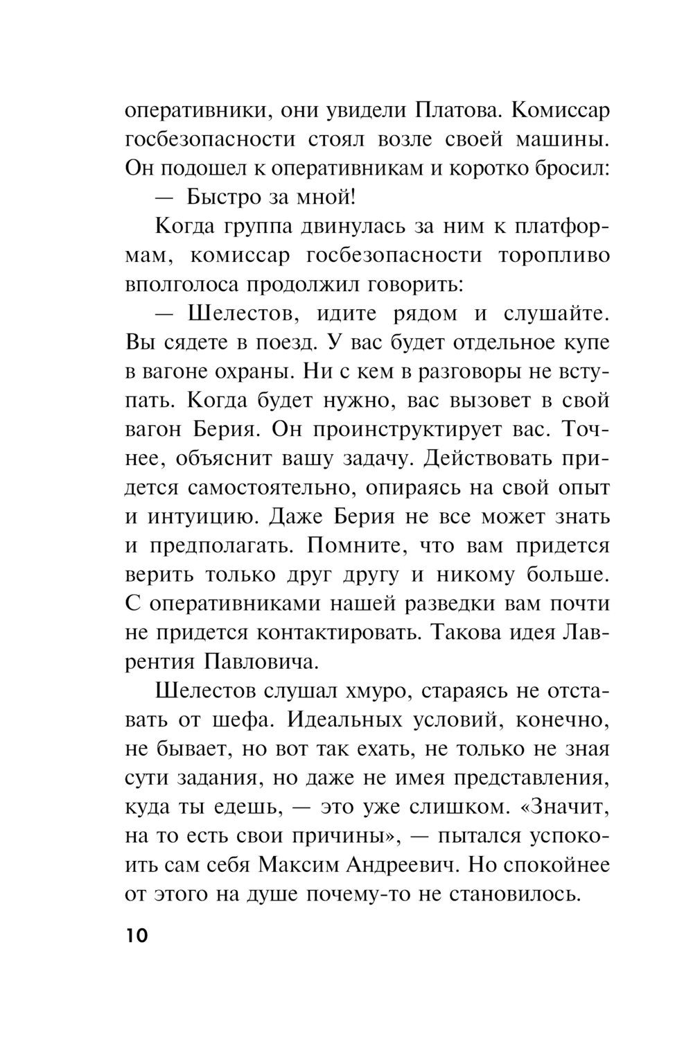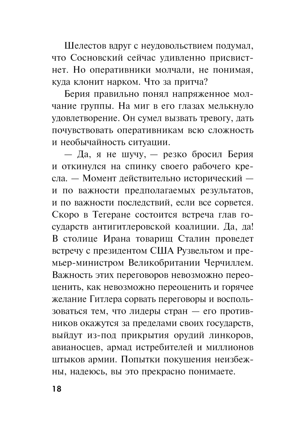 Осень 1943 года. В Тегеране готовится конференция глав государств-союзников. У советских спецслужб есть серьезные опасения, что немецкая агентура может сорвать высокую встречу. Группе майора Максима Шелестова поручено обеспечить безопасность нашей делегации. В Тегеране оперативники узнают, что незадолго до их прибытия в здание американского посольства проник неизвестный, после чего была взорвана машина начальника охраны дипмиссии США. Похоже, диверсанты готовы к самым смелым атакам. Шелестов разрабатывает ответный план, еще не догадываясь, какой необычный противник противостоит ему в этой схватке...