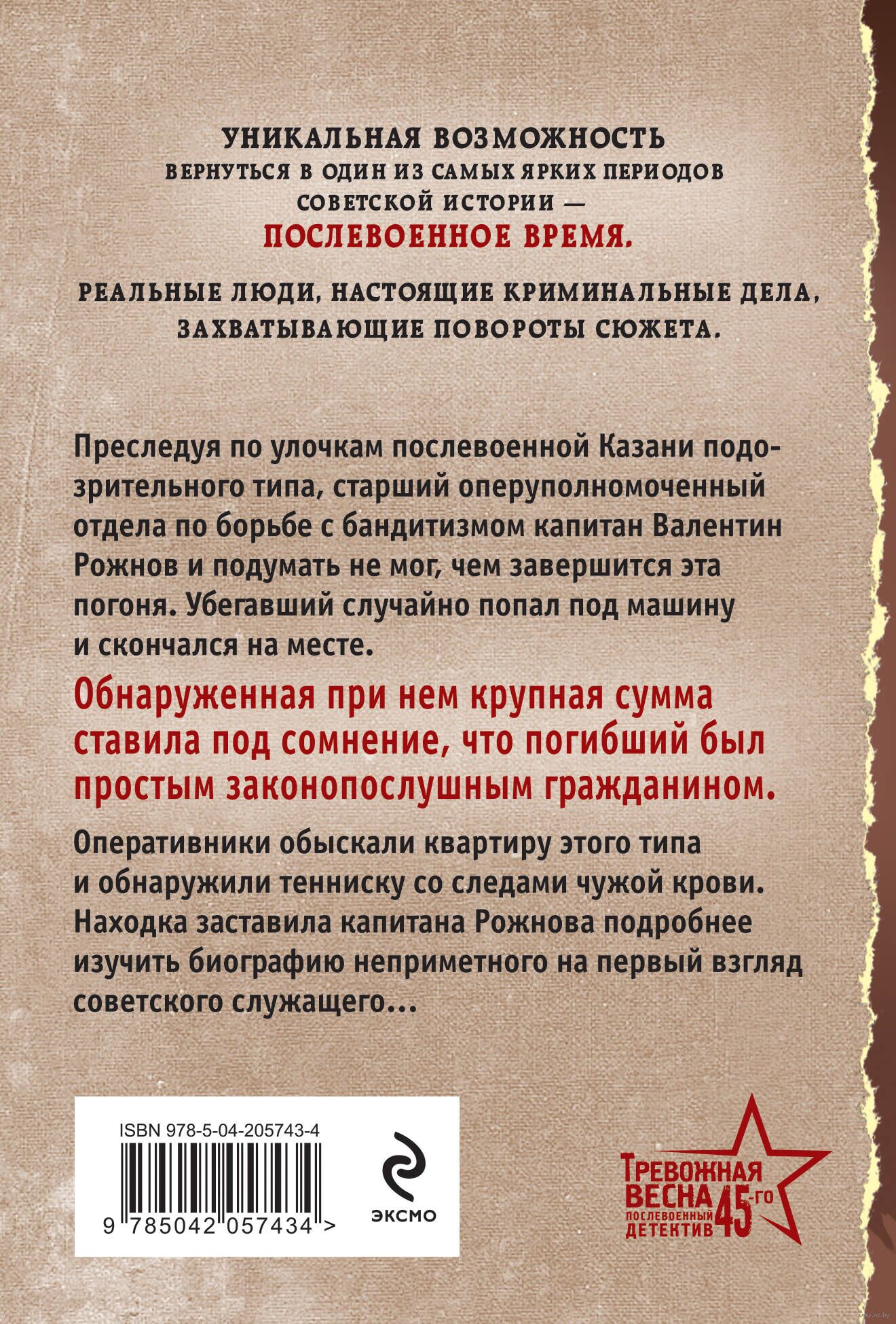 Преследуя по улочкам послевоенной Казани подозрительного типа, старший оперуполномоченный отдела по борьбе с бандитизмом капитан Валентин Рожнов и подумать не мог, чем завершится эта погоня. Убегавший случайно попал под машину и скончался на месте. Обнаруженная при нем крупная сумма ставила под сомнение, что погибший был простым законопослушным гражданином. Оперативники обыскали квартиру этого типа и обнаружили тенниску со следами чужой крови. Находка заставила капитана Рожнова подробнее изучить биографию неприметного, на первый взгляд, советского служащего...