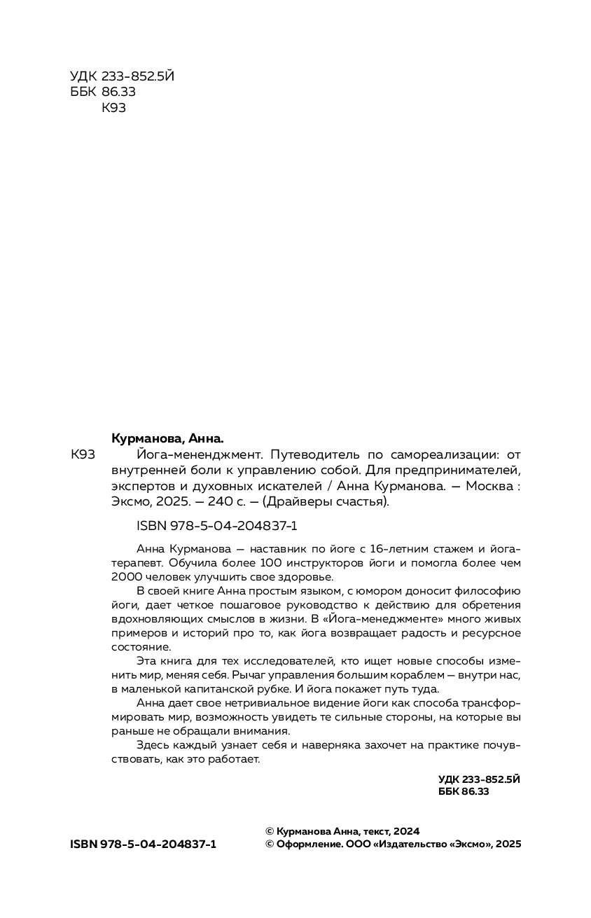 "Йога-менеджмент" – книга известного блогера, учителя и наставника йоги Анны Курмановой. Это уникальный "путеводитель" по внутренней трансформации человека с помощью принципов йоги и не только. Полезные практики и тренинги, упражнения и рассказ о том, в какой момент события нашей жизни начинают выводить нас на ту тропу, которая покажет, для чего мы родились. Как преодолеть эмоциональное истощение? И что значат наши 5 тел, как с ними работать, чтобы преобразовать себя, найти смысл жизни, предназначение и стать счастливым.