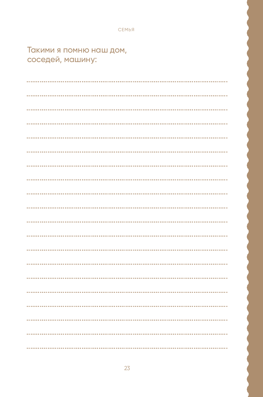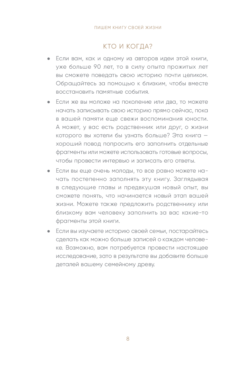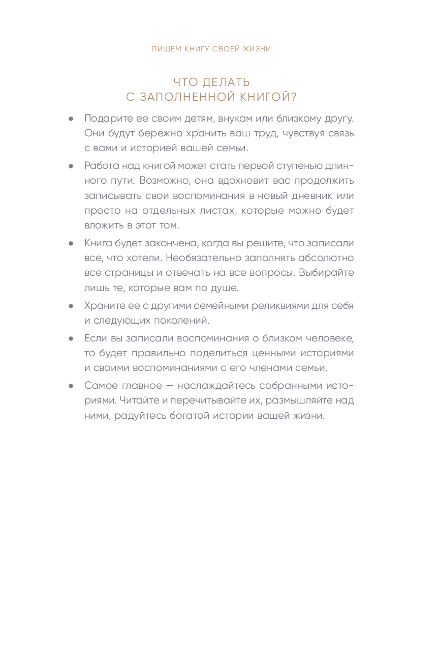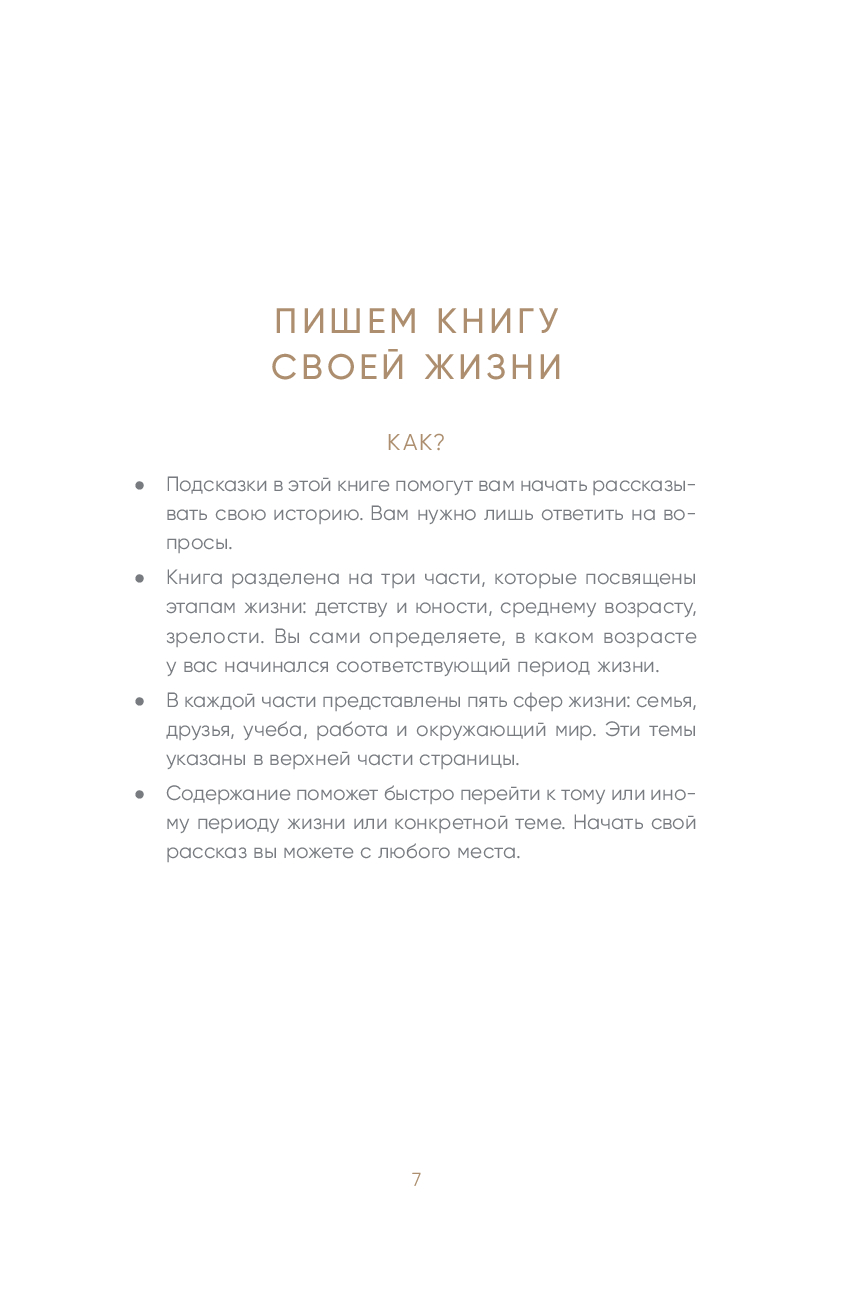 Самое ценное, что вы можете оставить будущим поколениям, – это память о времени, в котором вы жили, и людях, которые вас окружали. Начните писать историю вашей жизни. Вам нужно лишь ответить на вопросы, которые помогут вам вспомнить самые важные и драгоценные моменты: первая влюбленность, первое разочарование, традиции вашей семьи, отношения с близкими. Читайте и перечитывайте их, размышляйте над ними, радуйтесь богатой истории своей жизни.