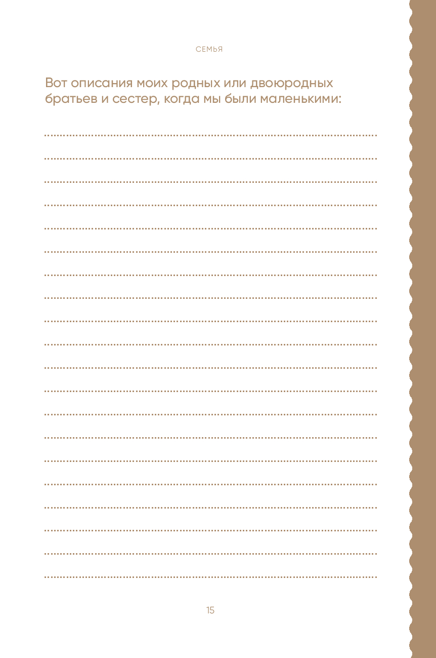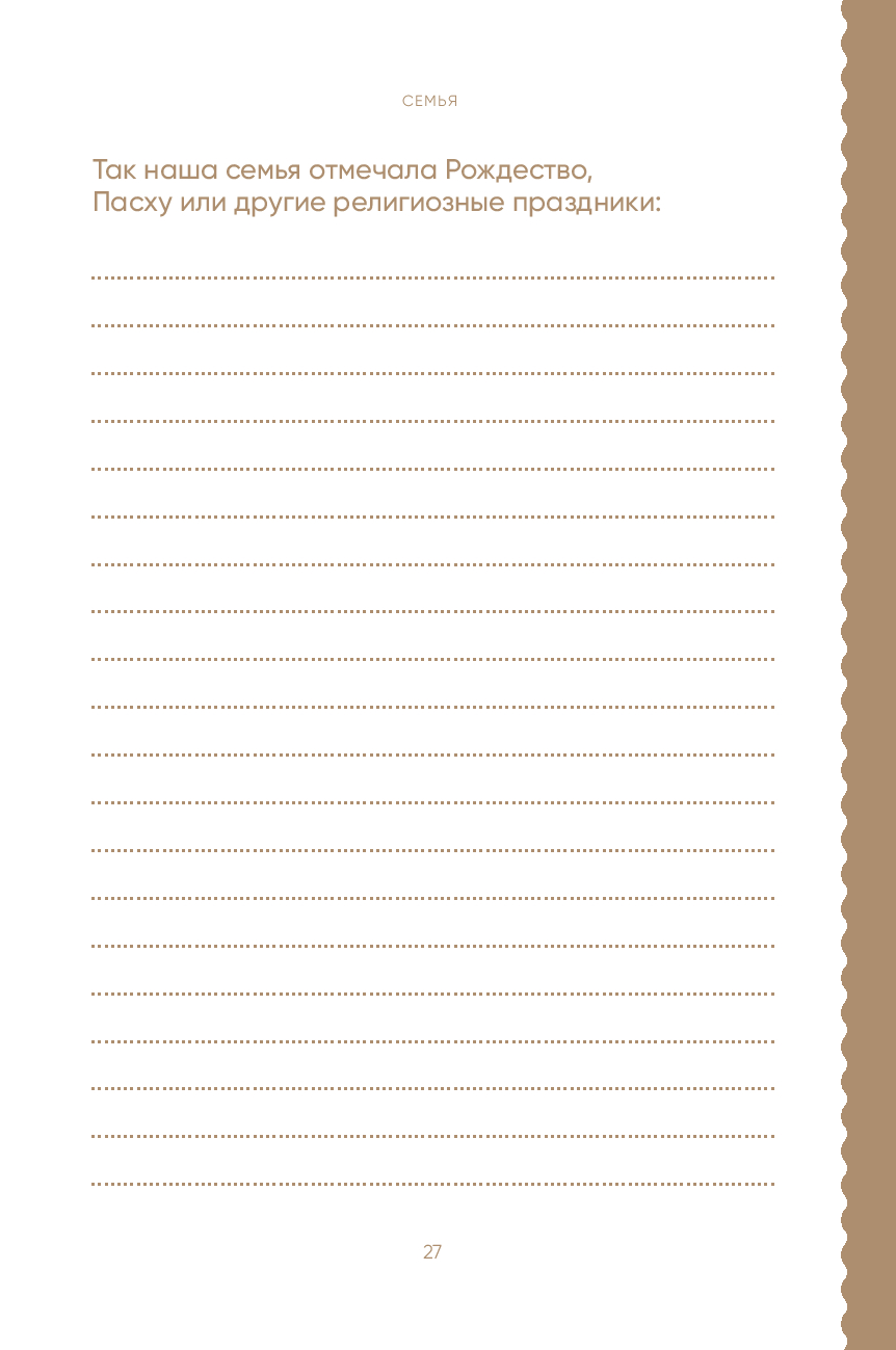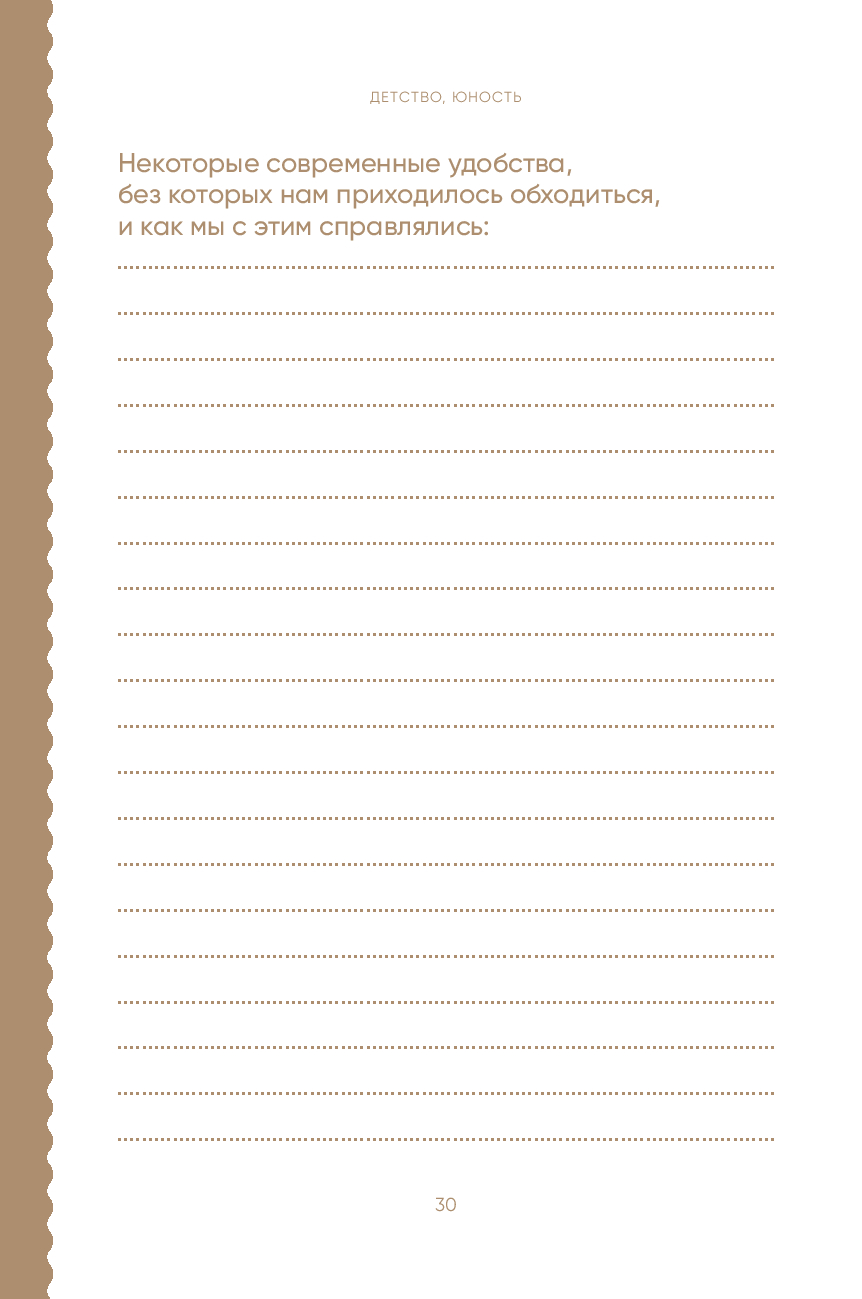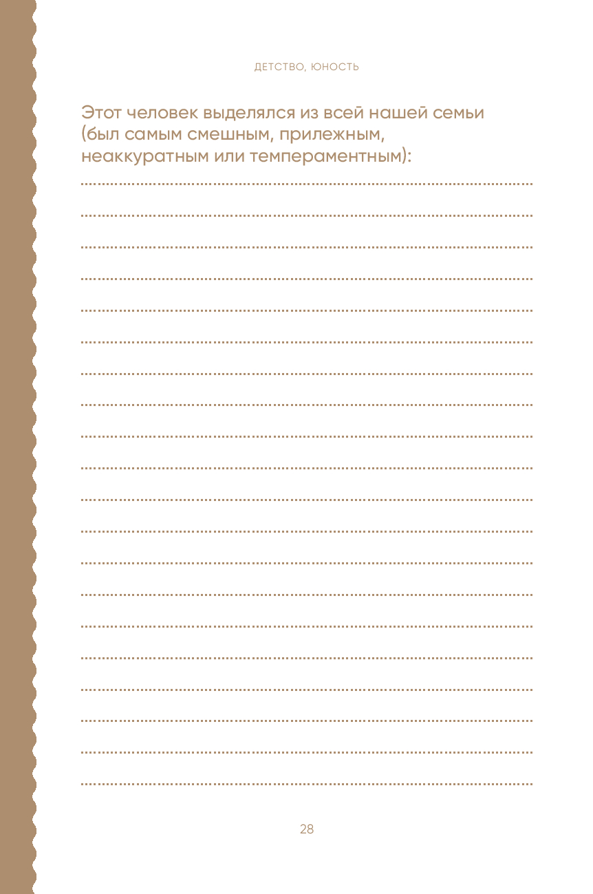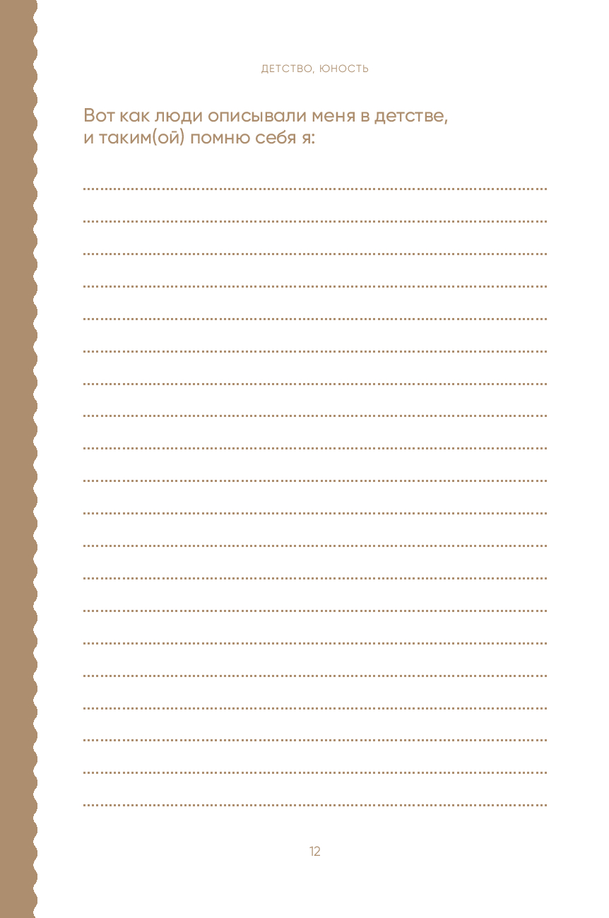 Самое ценное, что вы можете оставить будущим поколениям, – это память о времени, в котором вы жили, и людях, которые вас окружали. Начните писать историю вашей жизни. Вам нужно лишь ответить на вопросы, которые помогут вам вспомнить самые важные и драгоценные моменты: первая влюбленность, первое разочарование, традиции вашей семьи, отношения с близкими. Читайте и перечитывайте их, размышляйте над ними, радуйтесь богатой истории своей жизни.