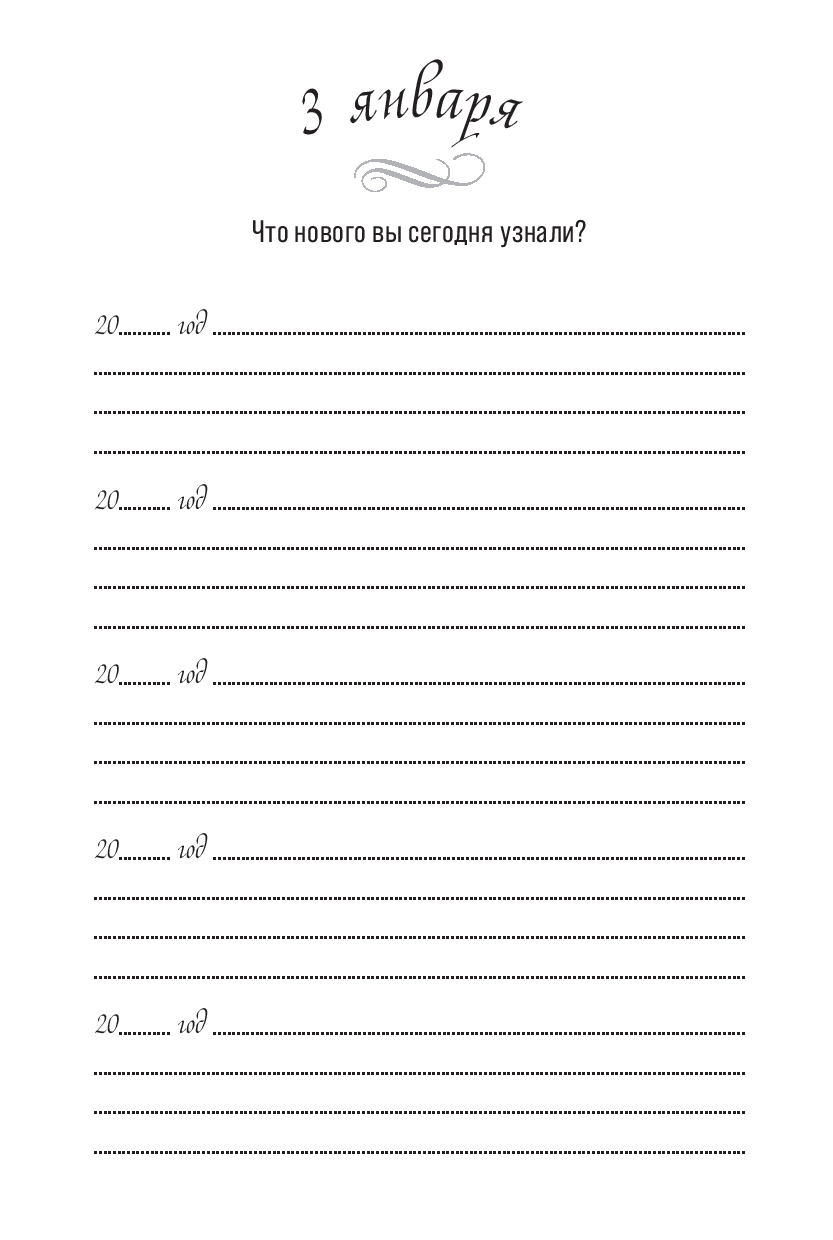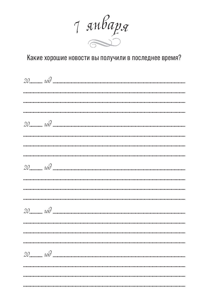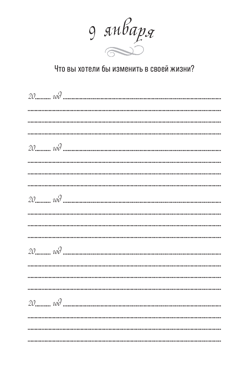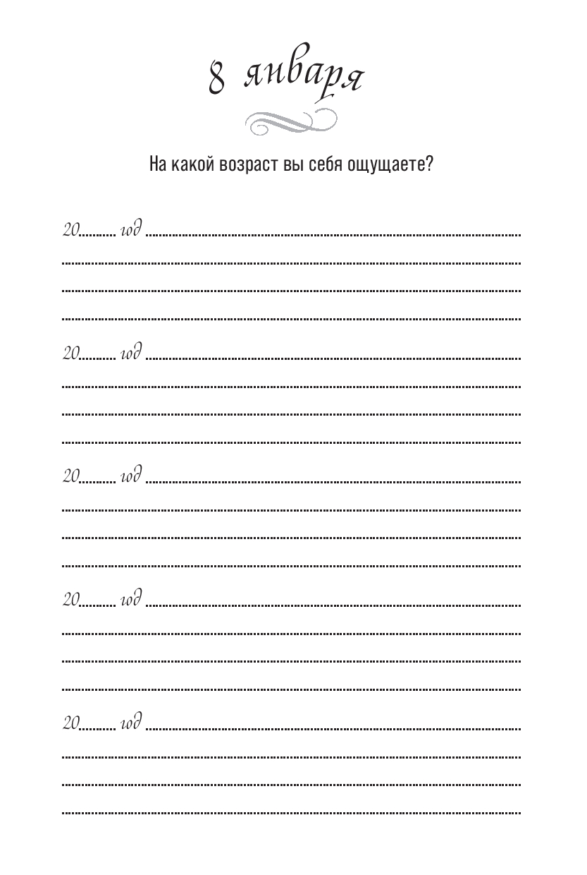 На каждой странице этого пятибука вы найдете вопрос, отвечая на который каждый год в один и тот же день, вы сможете проанализировать изменения своего состояния и мыслей. Здесь собраны разные вопросы – от прозаических до тех, которые касаются смысла жизни. Ежедневник поможет расслабиться после напряженного дня, отдохнуть, привести мысли в порядок, а также повысить осознанность, научиться фиксировать мысли и эмоции.