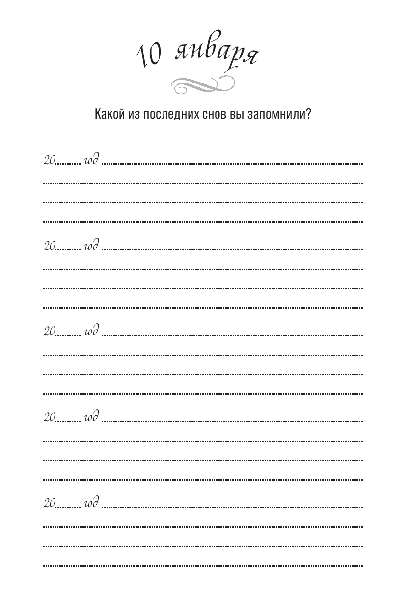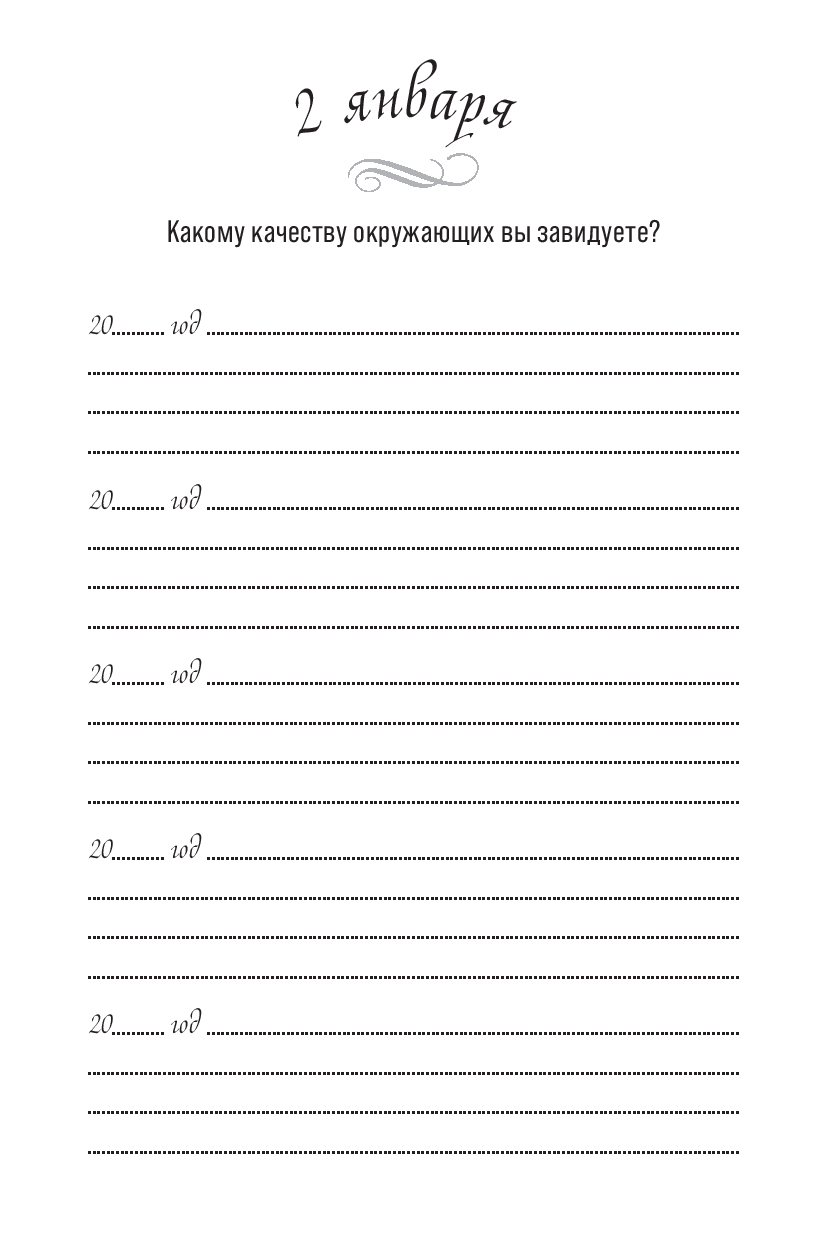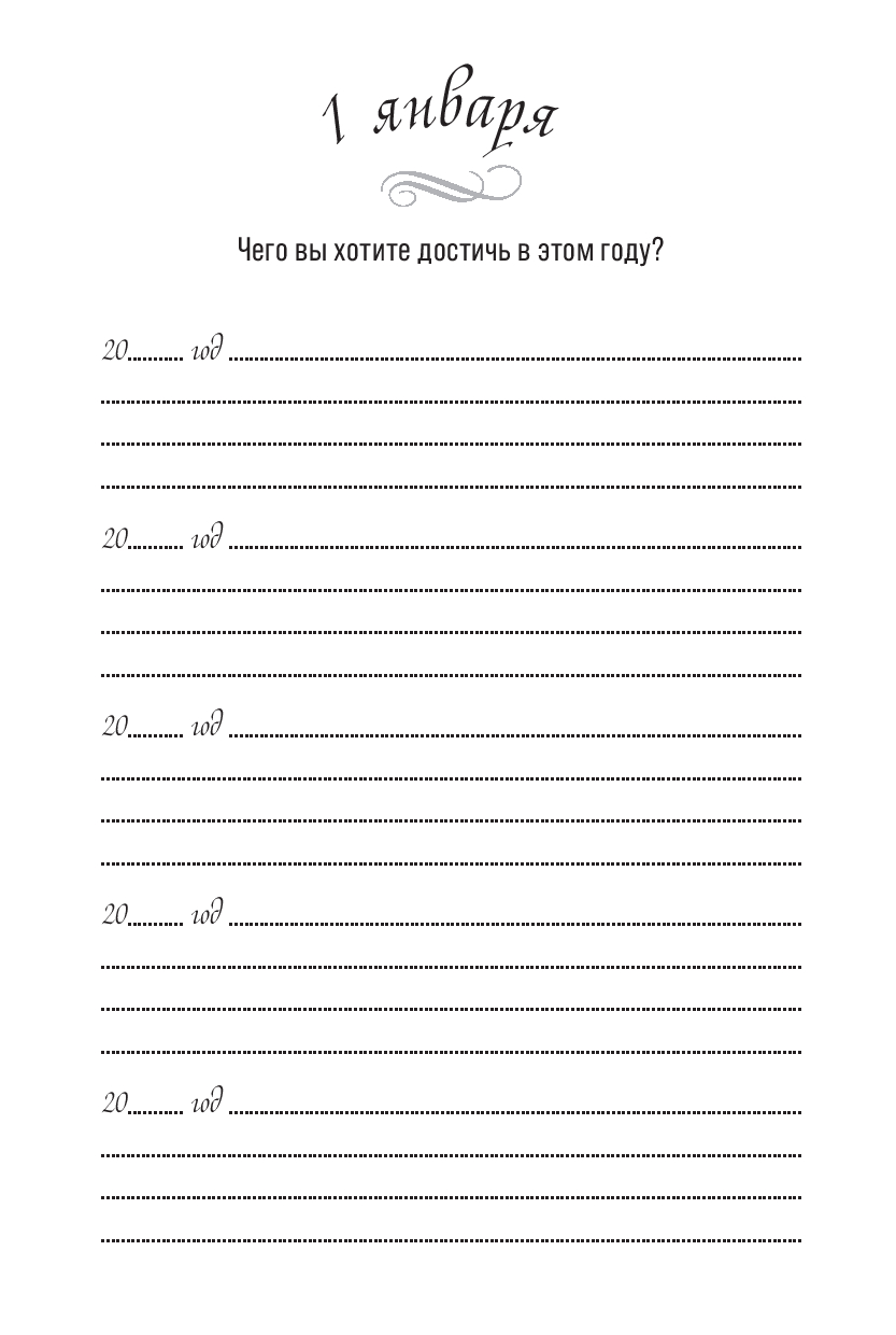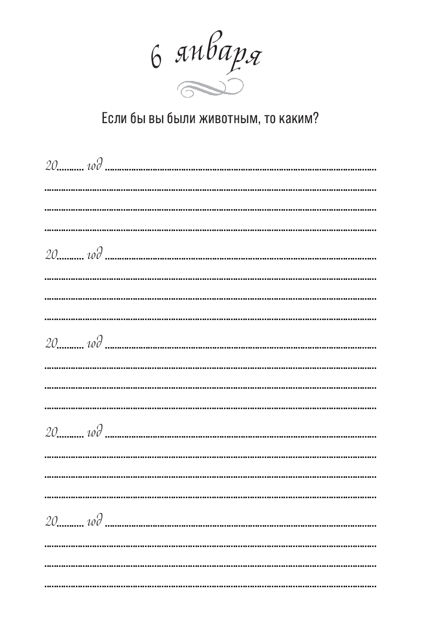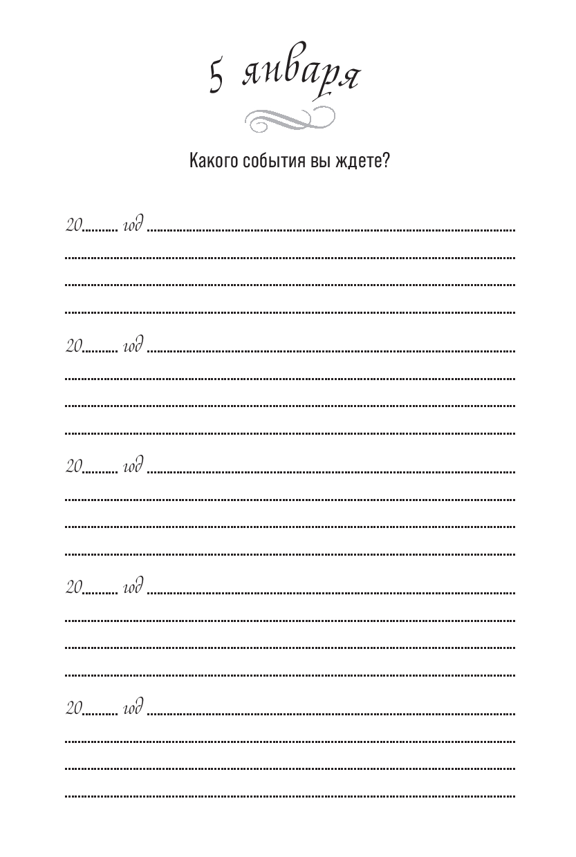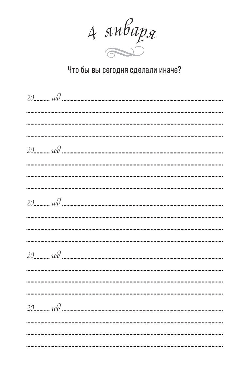 На каждой странице этого пятибука вы найдете вопрос, отвечая на который каждый год в один и тот же день, вы сможете проанализировать изменения своего состояния и мыслей. Здесь собраны разные вопросы – от прозаических до тех, которые касаются смысла жизни. Ежедневник поможет расслабиться после напряженного дня, отдохнуть, привести мысли в порядок, а также повысить осознанность, научиться фиксировать мысли и эмоции.