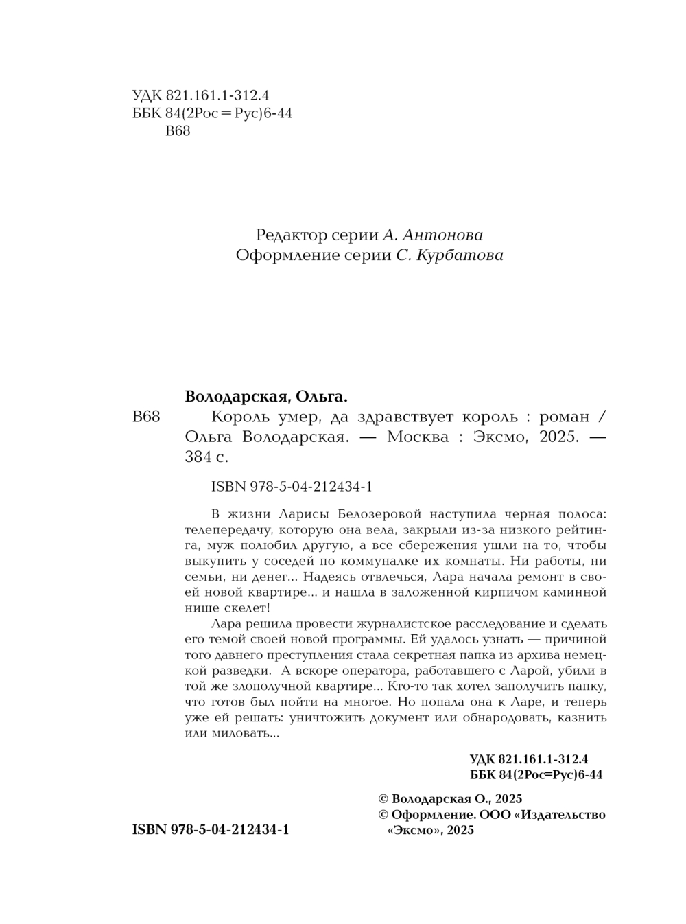 В жизни Ларисы Белозеровой наступила черная полоса: телепередачу, которую она вела, закрыли из-за низкого рейтинга, муж полюбил другую, а все сбережения ушли на то, чтобы выкупить у соседей по коммуналке их комнаты. Ни работы, ни семьи, ни денег... Надеясь отвлечься, Лара начала ремонт в своей новой квартире... и нашла в заложенной кирпичом каминной нише скелет!