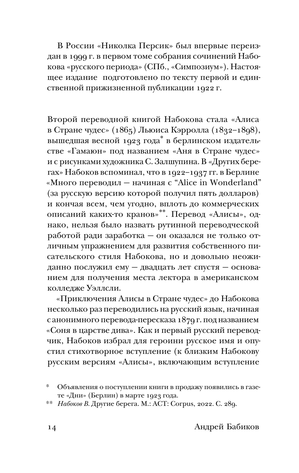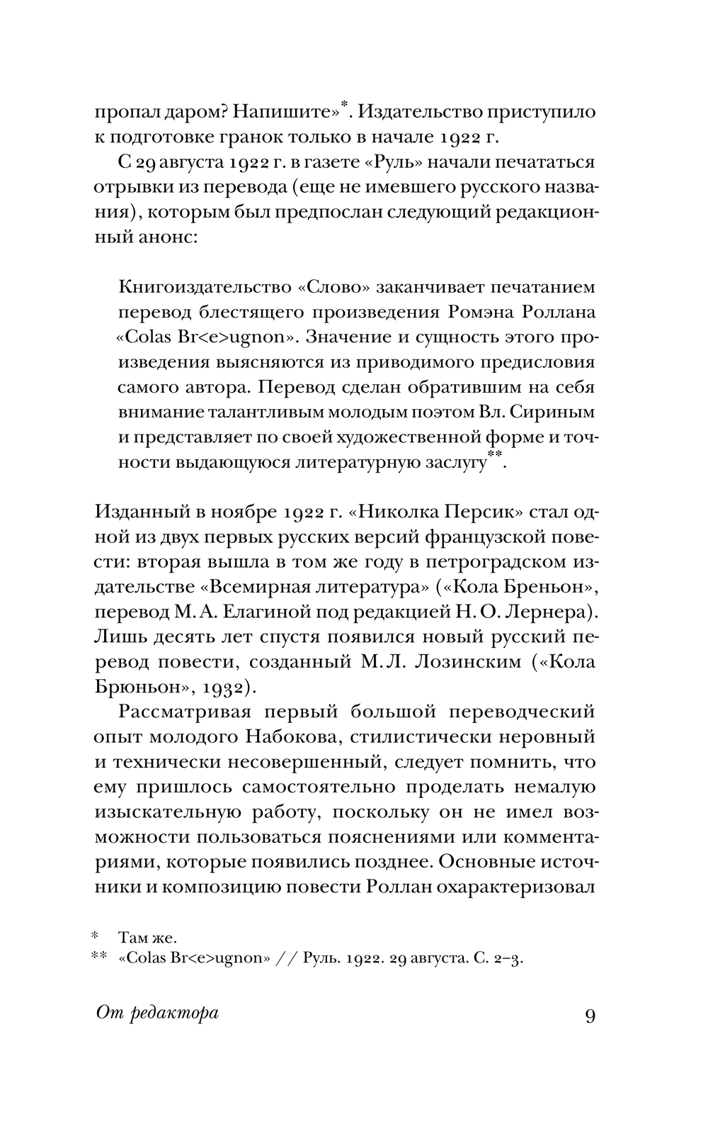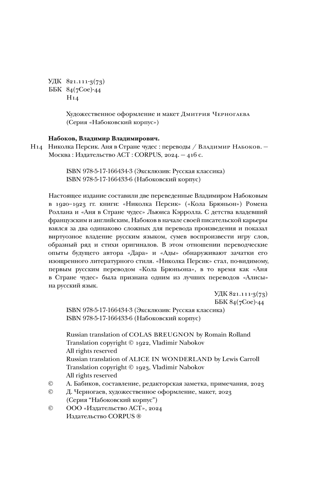 Настоящее издание составили две переведенные Владимиром Набоковым в 1920-1923 гг. книги: "Николка Персик" ("Кола Брюньон") Ромена Роллана и "Аня в Стране чудес" Льюиса Кэрролла. С детства владевший французским и английским, Набоков в начале своей писательской карьеры взялся за два одинаково сложных для перевода произведения и показал виртуозное владение русским языком, сумев воспроизвести игру слов, образный ряд и стихи оригиналов. В этом отношении переводческие опыты будущего автора "Дара" и "Ады" обнаруживают зачатки его изощренного литературного стиля. "Николка Персик" стал, по‑видимому, первым русским переводом "Кола Брюньона", в то время как "Аня в Стране чудес" была признана одним из лучших переводов "Алисы" на русский язык.