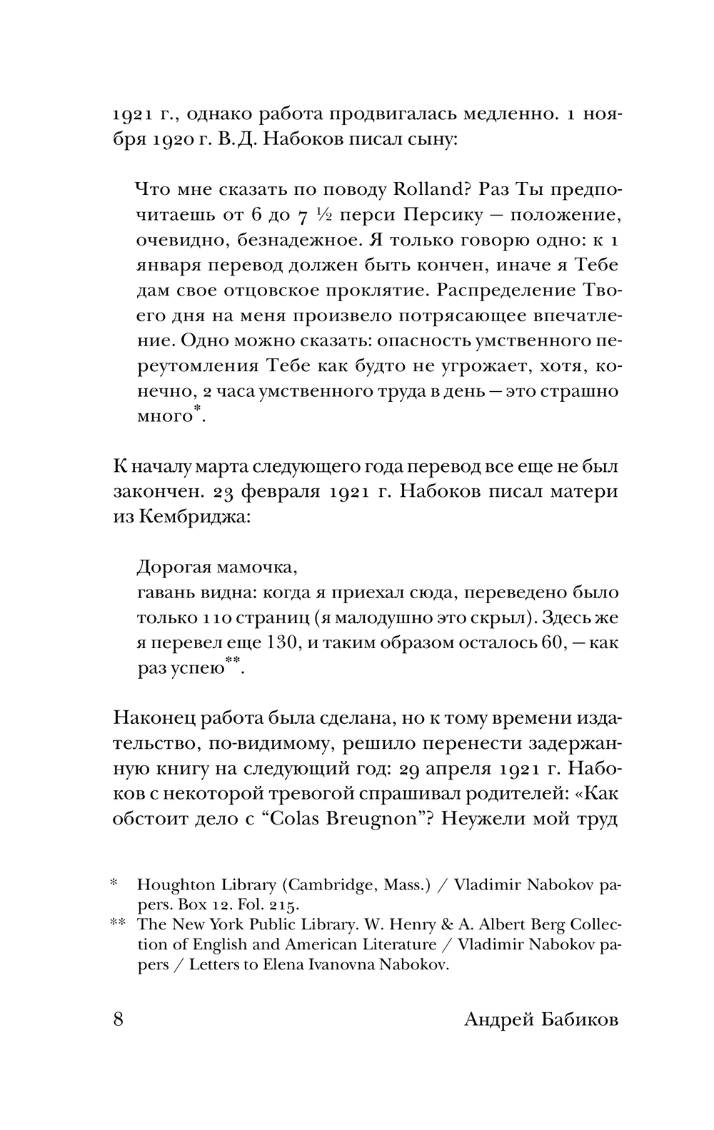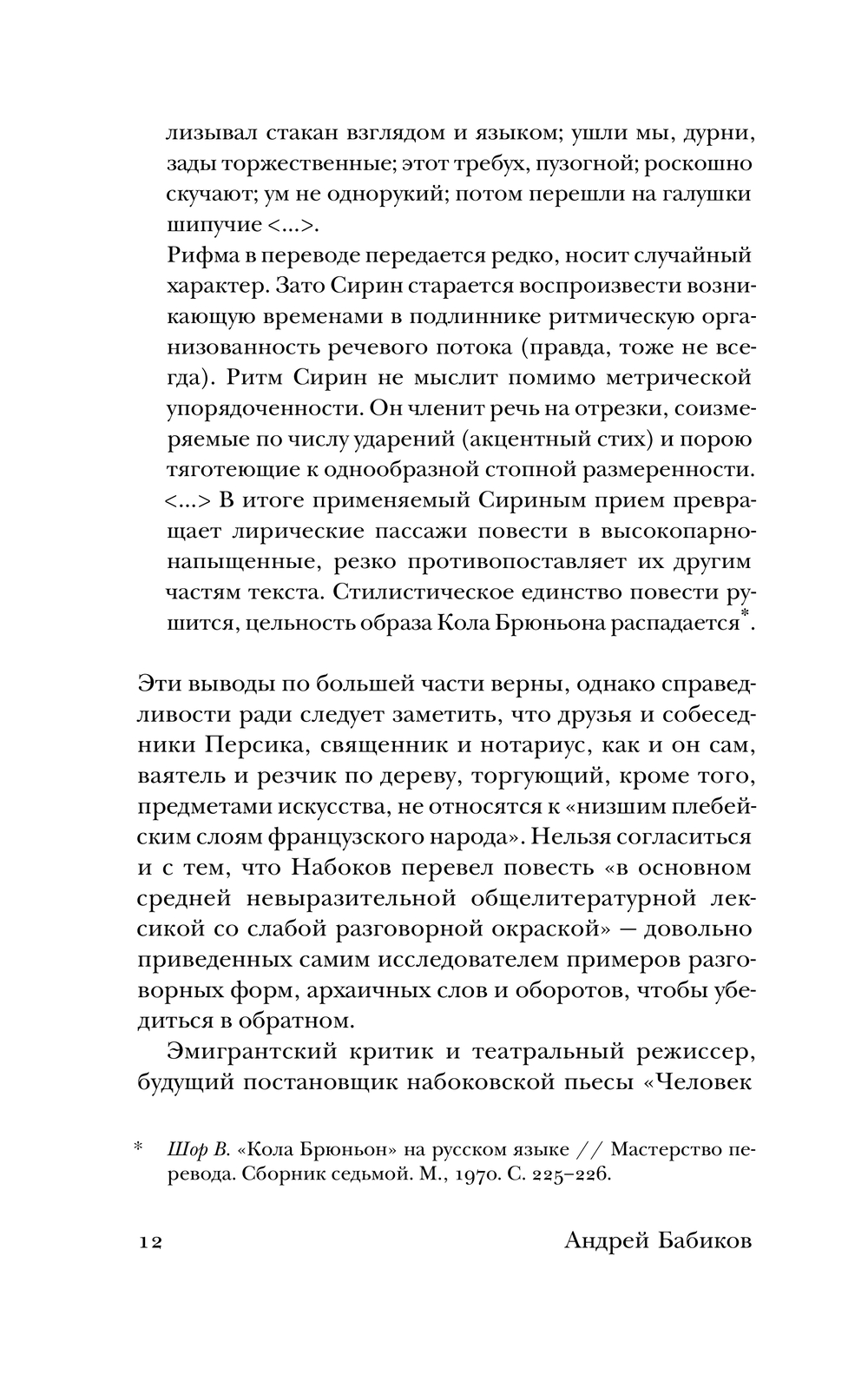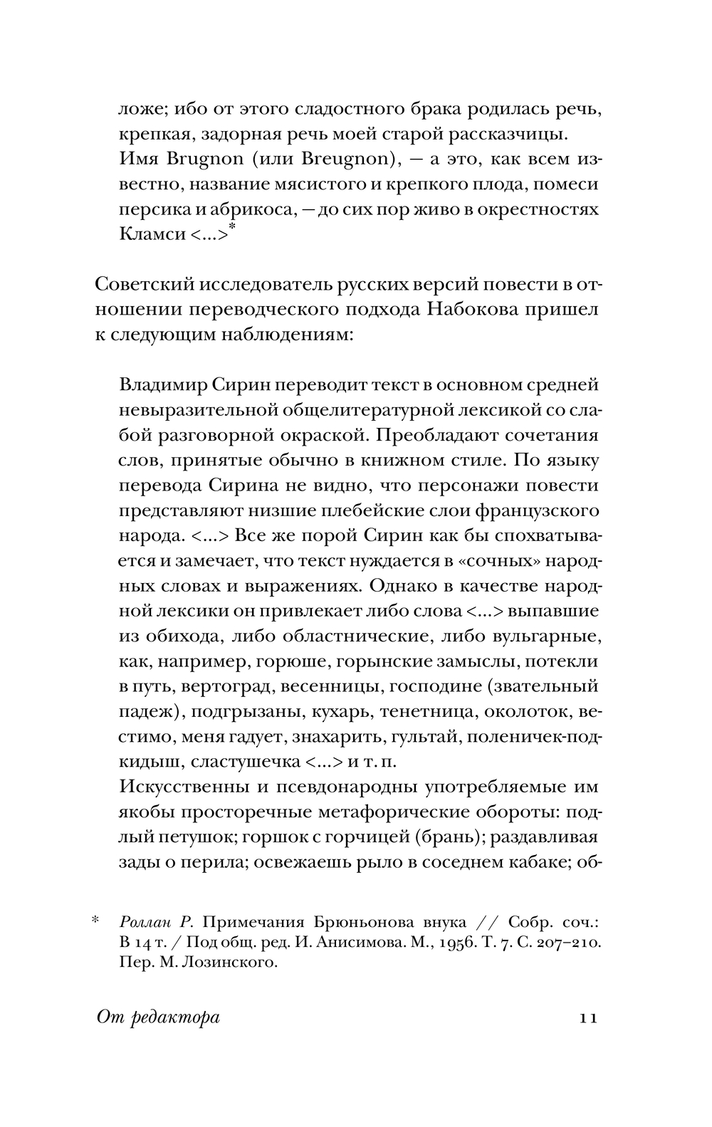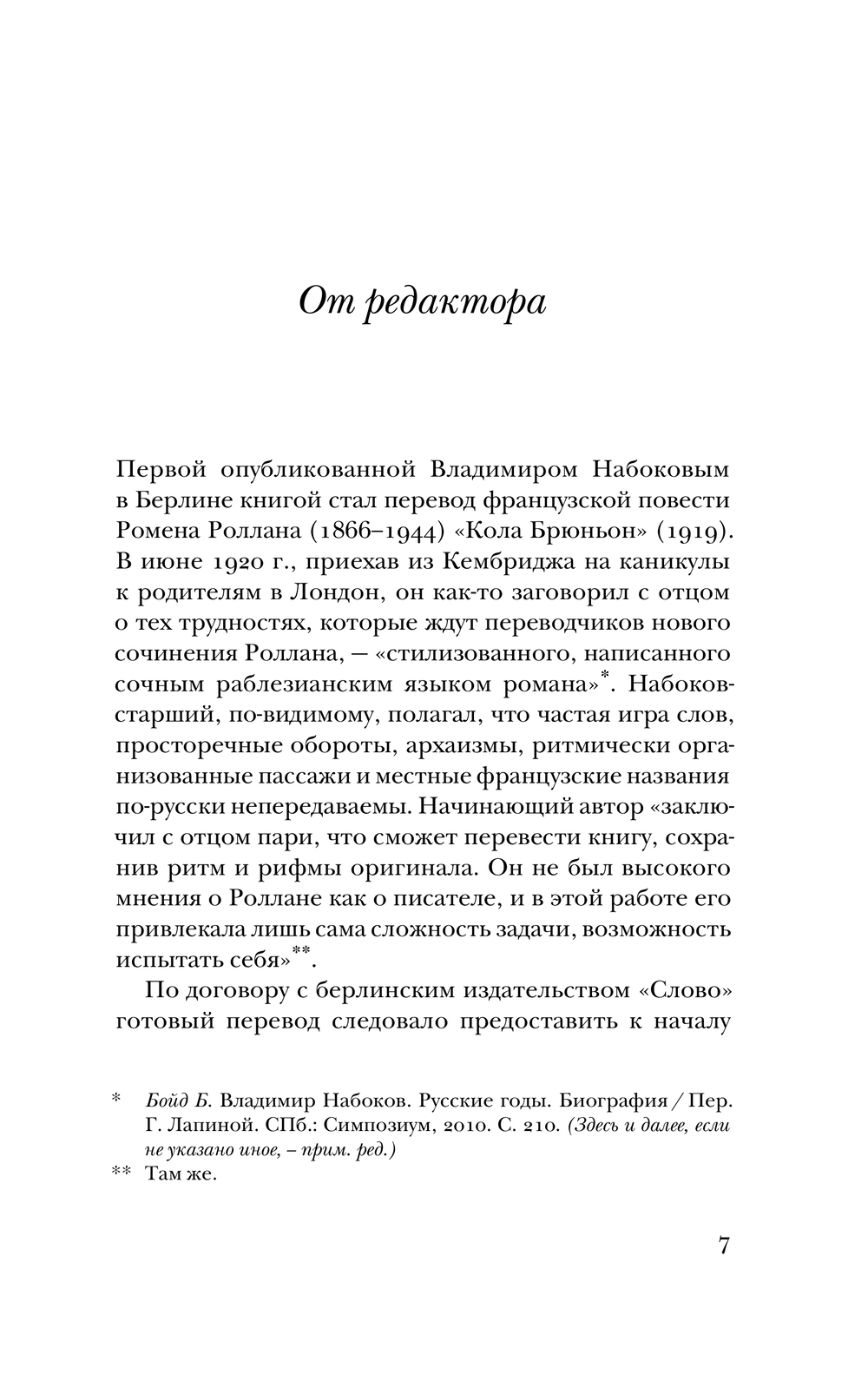 Настоящее издание составили две переведенные Владимиром Набоковым в 1920-1923 гг. книги: "Николка Персик" ("Кола Брюньон") Ромена Роллана и "Аня в Стране чудес" Льюиса Кэрролла. С детства владевший французским и английским, Набоков в начале своей писательской карьеры взялся за два одинаково сложных для перевода произведения и показал виртуозное владение русским языком, сумев воспроизвести игру слов, образный ряд и стихи оригиналов. В этом отношении переводческие опыты будущего автора "Дара" и "Ады" обнаруживают зачатки его изощренного литературного стиля. "Николка Персик" стал, по‑видимому, первым русским переводом "Кола Брюньона", в то время как "Аня в Стране чудес" была признана одним из лучших переводов "Алисы" на русский язык.