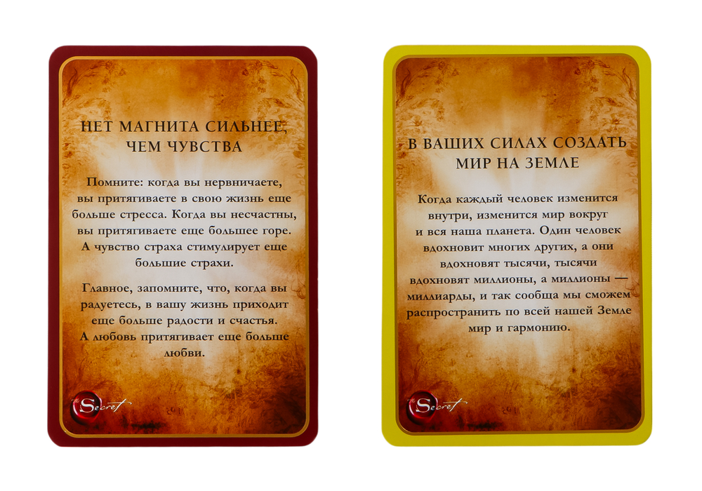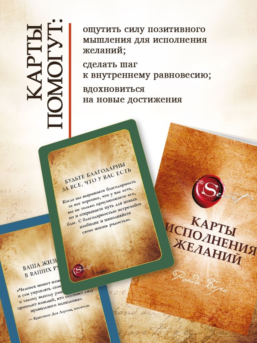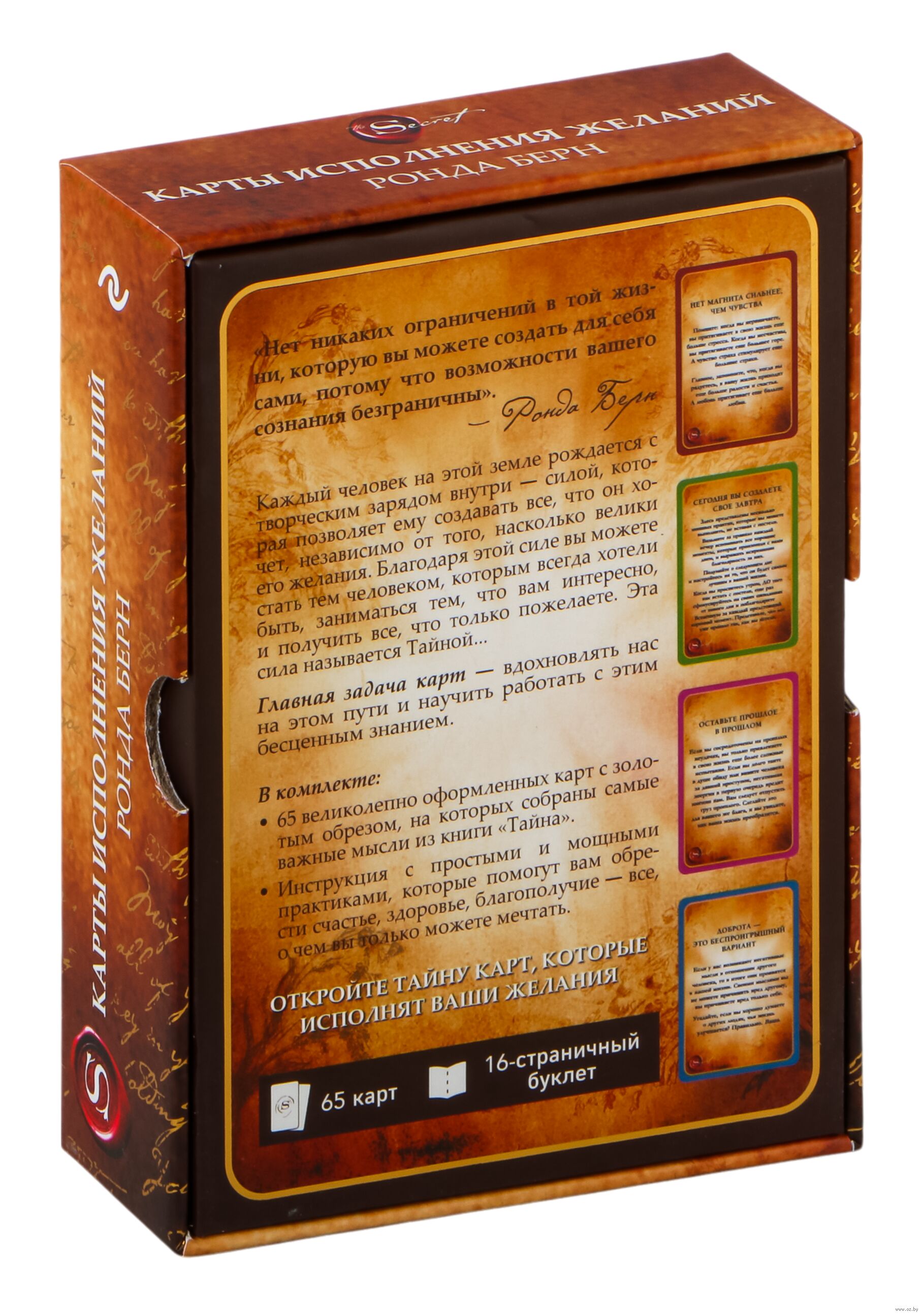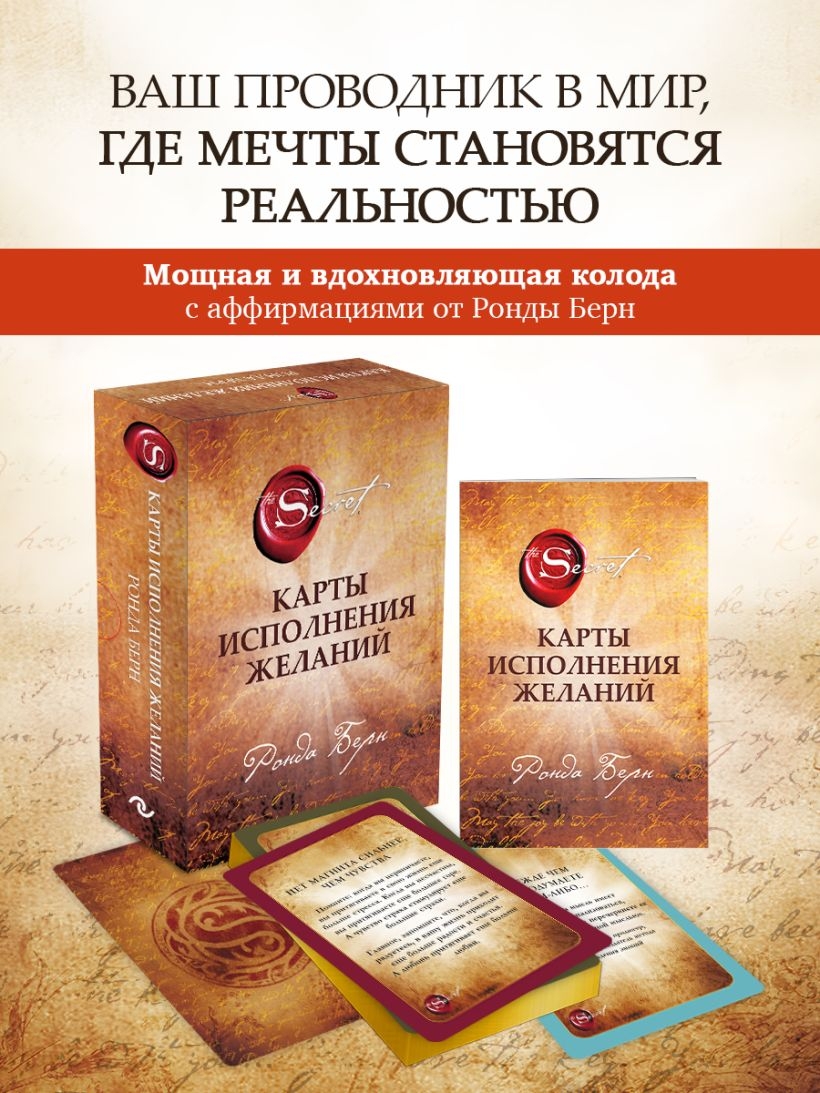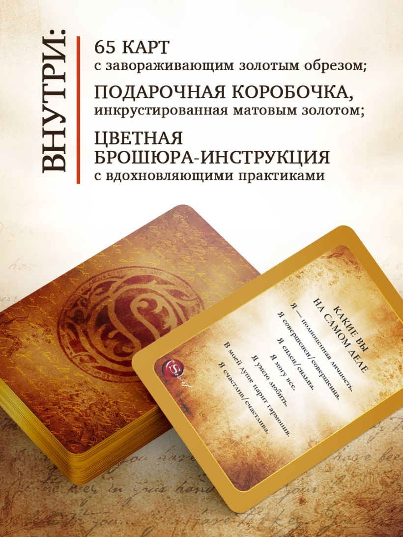 65 карт с завораживающим золотым обрезом и цитатами из книги автора мегабестселлера "Тайна" помогут исполнить ваши желания. Роскошный короб, инкрустированный тиснением с матовым золотом, цветная брошюра-инструкция с вдохновляющими практиками – в комплекте.