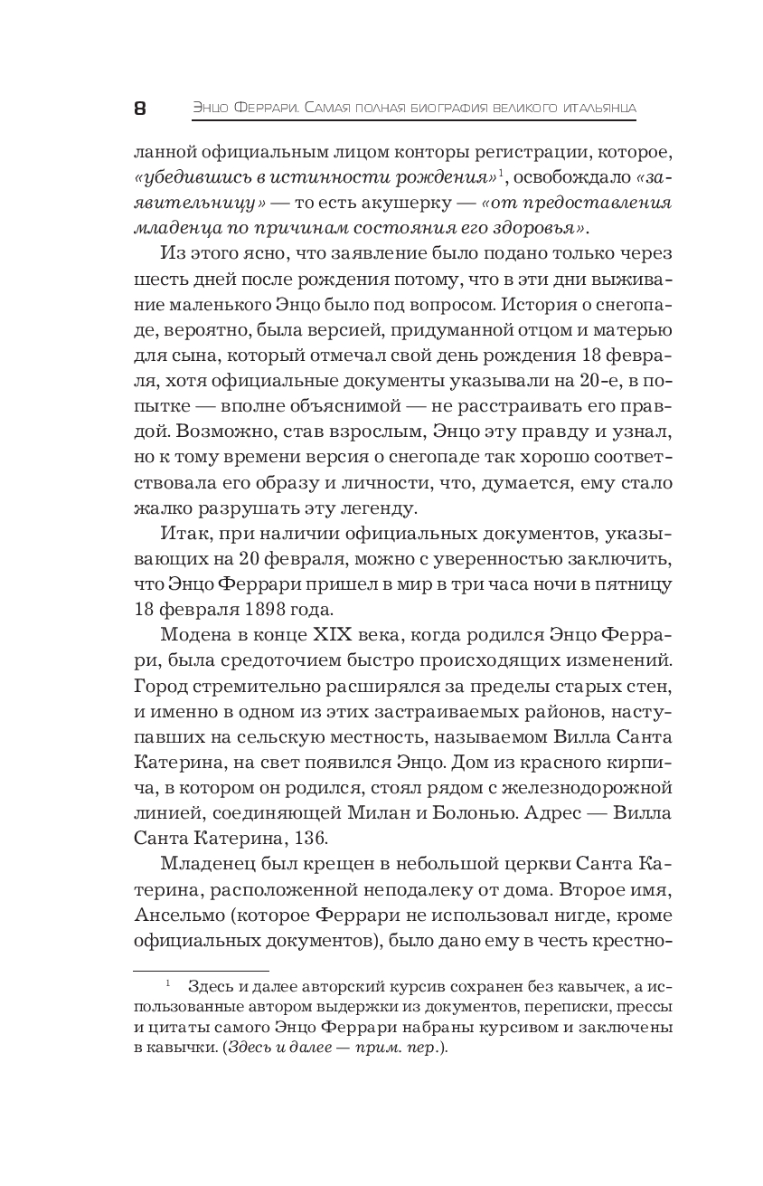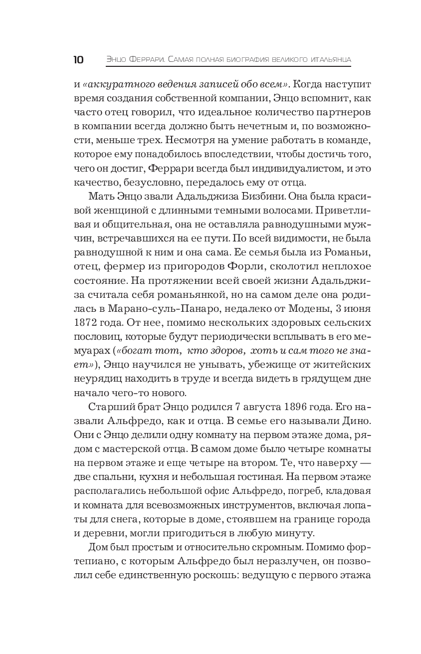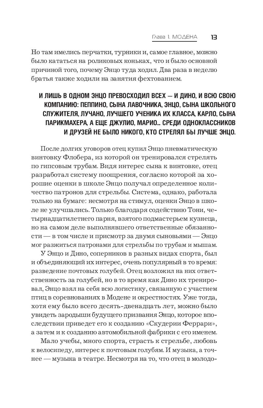 Книга рассказывает о том, как создавалась компания "Феррари", о ее борьбе с сильнейшим конкурентами – "Фиат", "Альфа-Ромео", "Мазерати", "Мерседес" и другими, – о том, как Феррари выстраивал работу с инженерами, пилотами и покупателями его автомобилей, как неоднократно терял близких ему людей и на трассах, и вне гонок, как испытывал давление со стороны государства, прессы и Церкви, как шаг за шагом, упорно и вопреки многим обстоятельствам, шел к вершине автомобильной индустрии и мирового автоспорта.