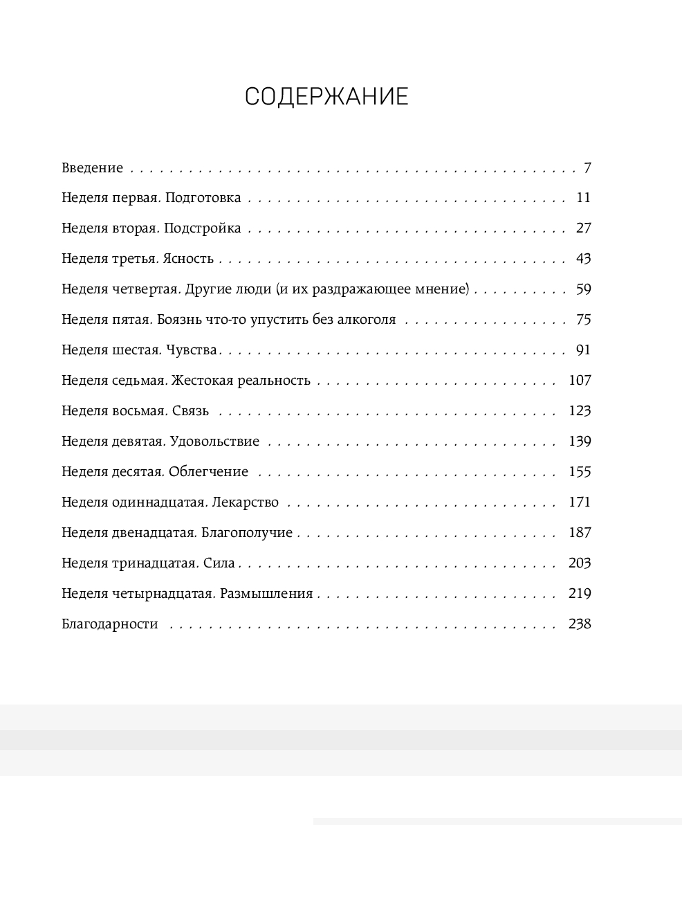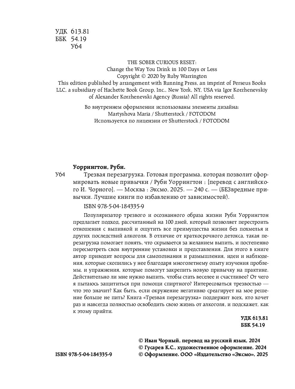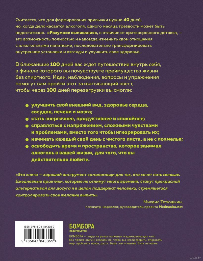 Популяризатор трезвого и осознанного образа жизни Руби Уоррингтон предлагает подход, рассчитанный на 100 дней, который позволяет перестроить отношения с выпивкой и ощутить все преимущества жизни без похмелья и других последствий алкоголя. В отличие от краткосрочного детокса, такая перезагрузка помогает понять, что скрывается за желанием выпить, и постепенно пересмотреть свои внутренние установки и представления. Для этого в книге автор приводит вопросы для самопознания и размышления, идеи и наблюдения, которые скопились у нее благодаря многолетнему опыту изучения проблемы, и упражнения, которые помогут закрепить новую привычку на практике.