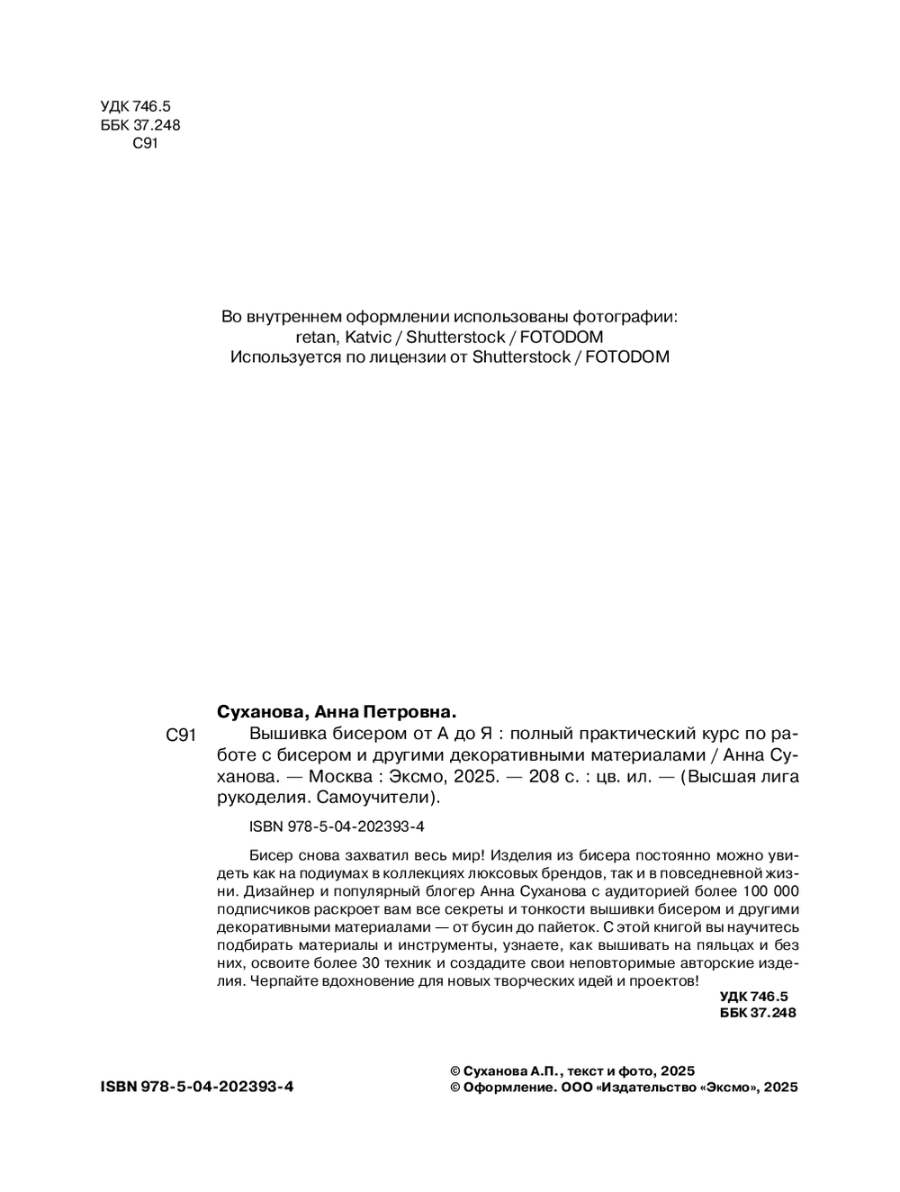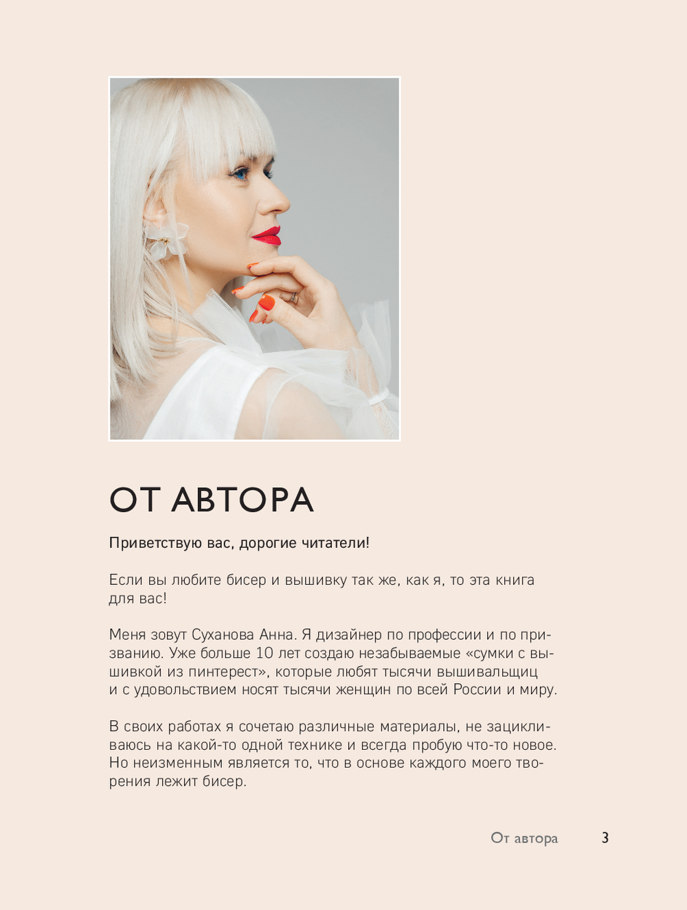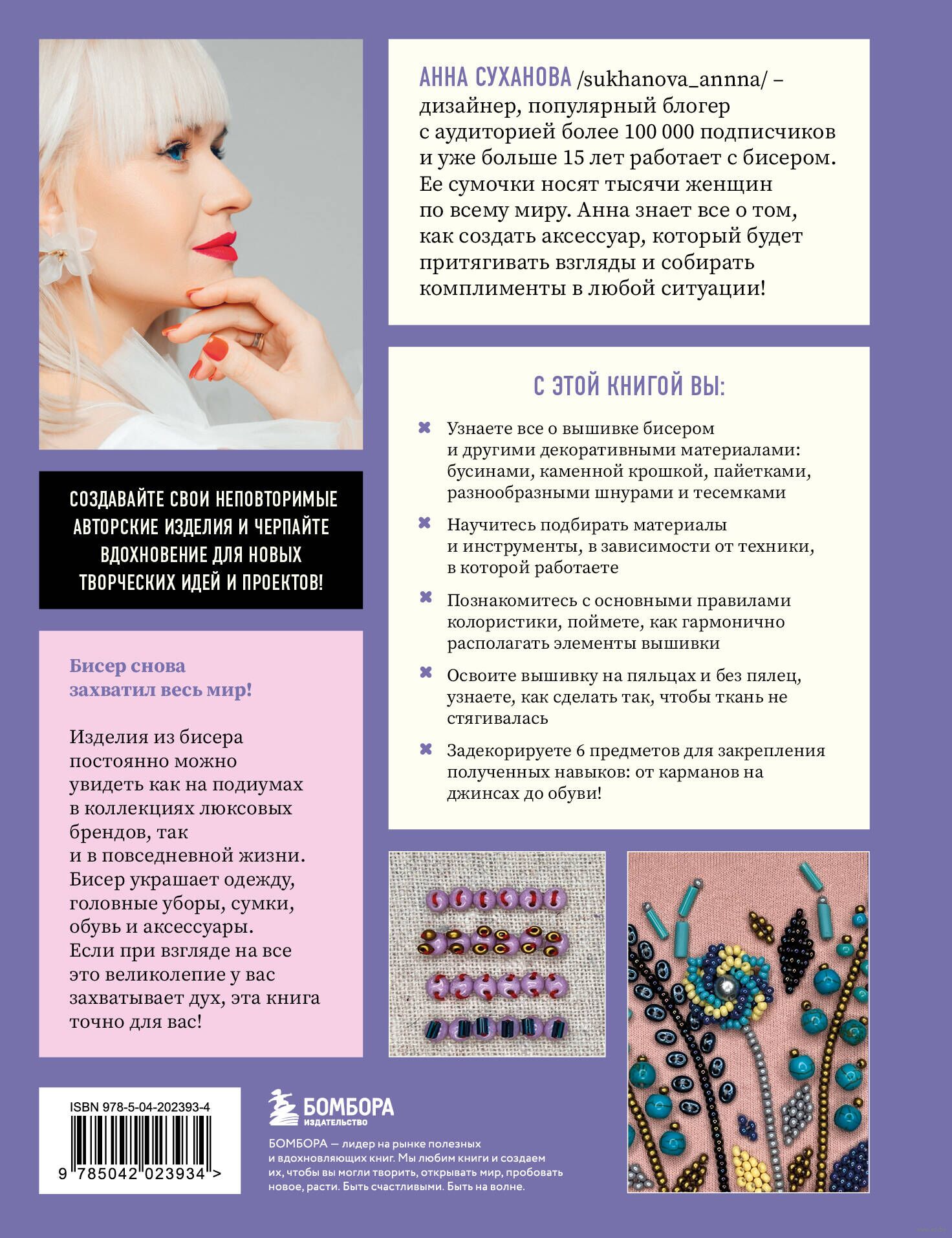 Бисер снова захватил весь мир! Изделия из бисера постоянно можно увидеть как на подиумах в коллекциях люксовых брендов, так и в повседневной жизни. Дизайнер и популярный блогер Анна Суханова с аудиторией более 100 000 подписчиков раскроет вам все секреты и тонкости вышивки бисером и другими декоративными материалами от бусин до пайеток. С этой книгой вы научитесь подбирать материалы и инструменты, узнаете, как вышивать на пяльцах и без них, освоите более 30 техник, и создадите свои неповторимые авторские изделия. Черпайте вдохновение для новых творческих идей и проектов!