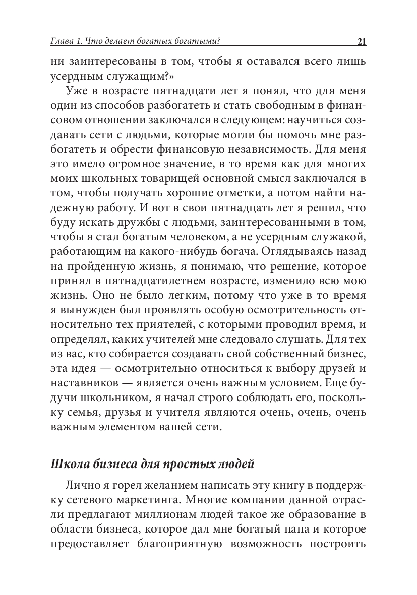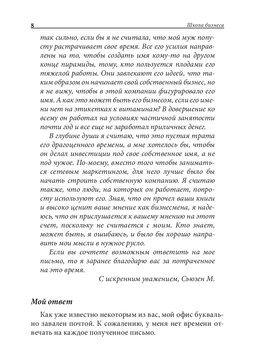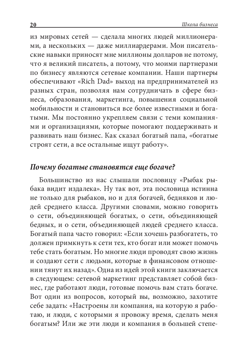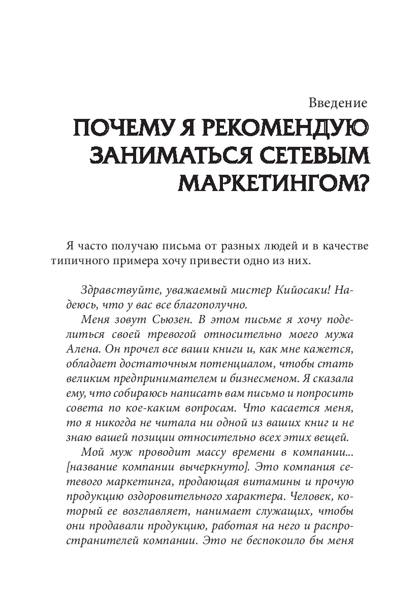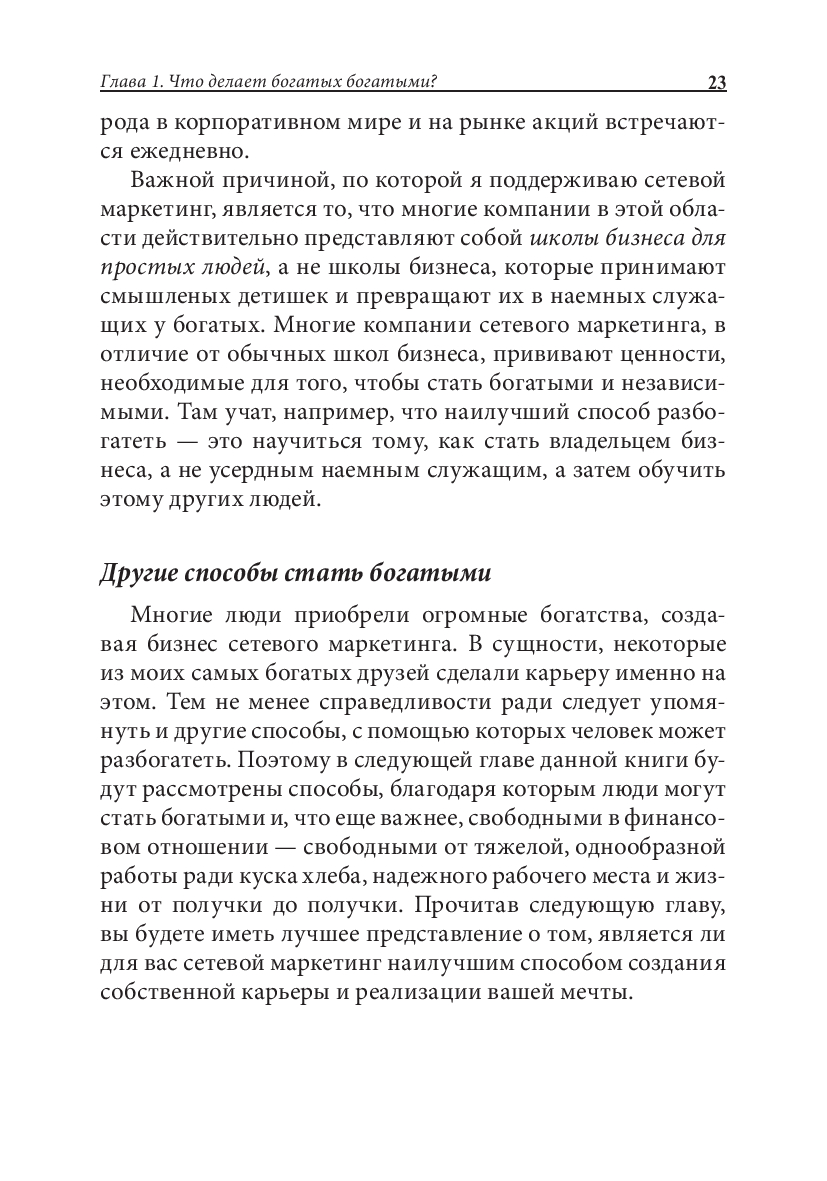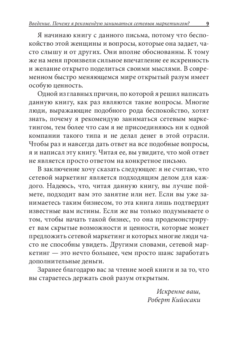 "Но что же заставило Роберта Кийосаки, никогда не занимавшегося этим видом бизнеса, посвятить ему целую книгу?" – спросите вы. Дело в том, что для сетевого маркетинга характерны 8 скрытых преимуществ – и в их суть необходимо вникнуть каждому, чья цель не просто высокая зарплата, а настоящее богатство.