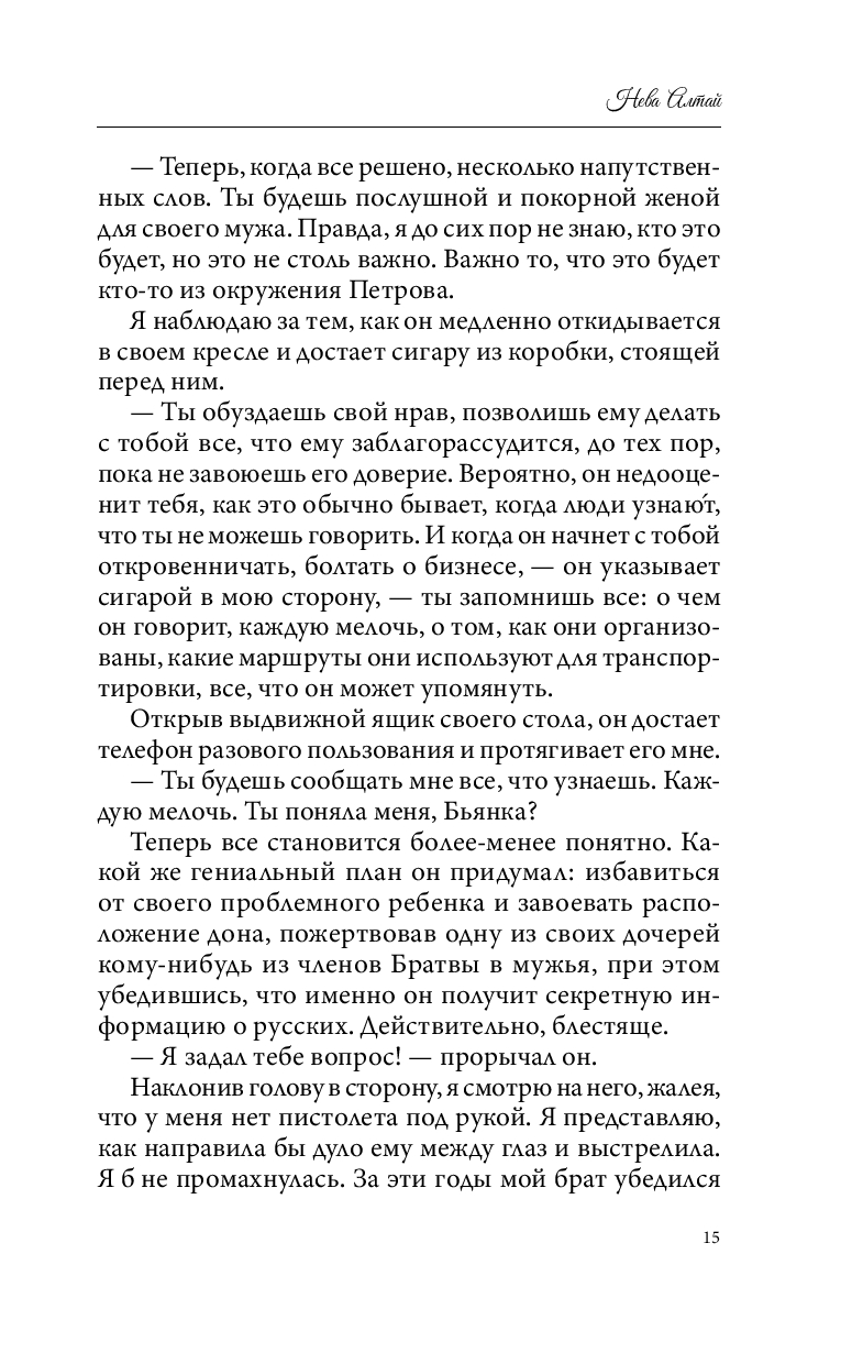 Что угодно, я бы сделала что угодно ради моей сестры. Даже вышла бы замуж за члена Братвы, только чтобы уберечь ее. Я ожидала порочного, хладнокровного дикаря,но меня ждет сюрприз. Этот страшный мужчина со шрамами – все, чего я когда-либо хотела. Теперь все зависит только от меня: разрушу ли я стены и уничтожу барьеры, вставшие между нами, одним лишь прерывистым шепотом?