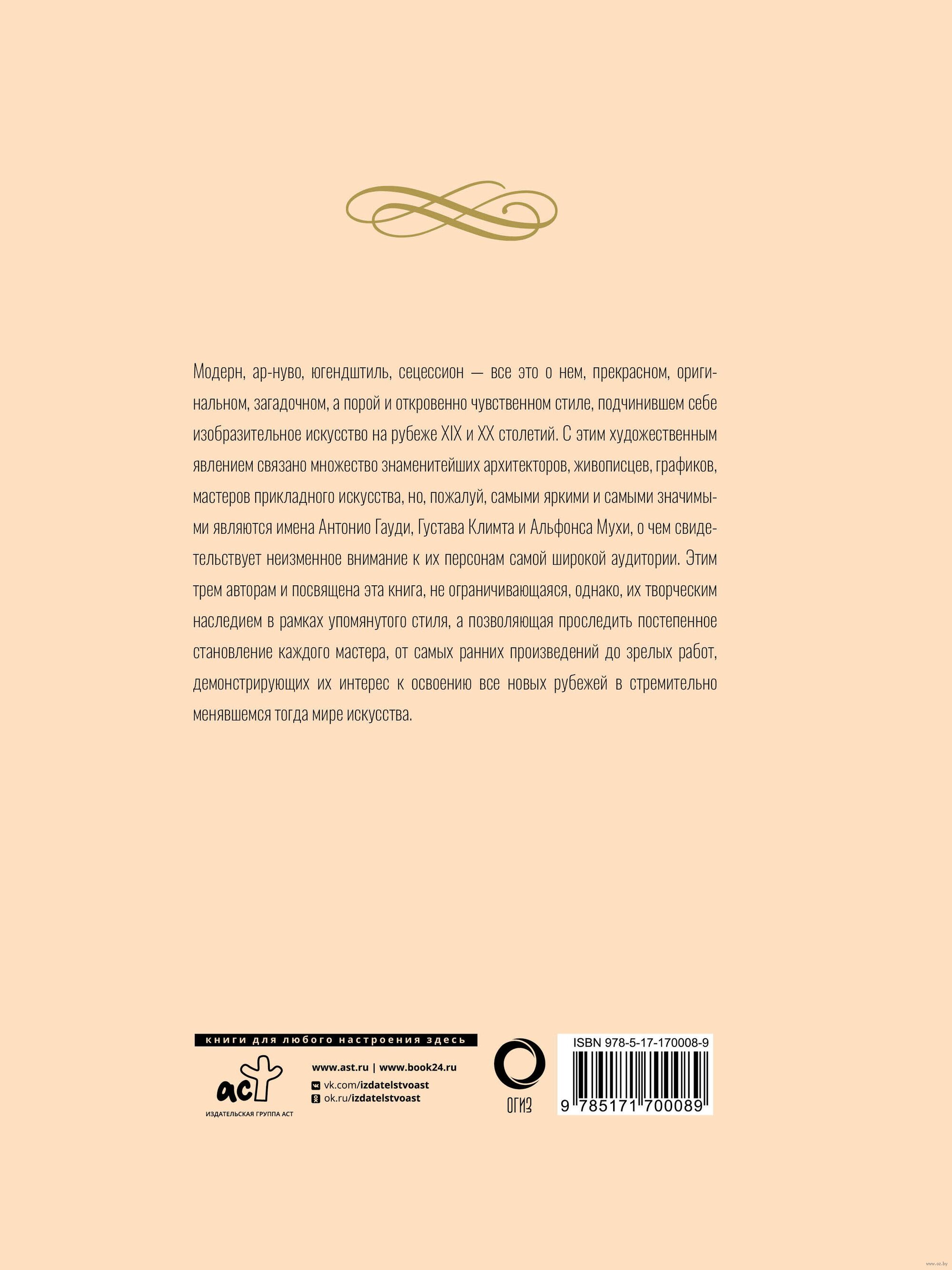 Модерн, ар-нуво, югендштиль, сецессион – все это о нем, прекрасном, оригинальном, загадочном, а порой и откровенно-чувственном стиле, подчинившем себе изобразительное искусство на рубеже XIX и XX столетий. С этим художественным явлением связано множество знаменитейших архитекторов, живописцев, графиков, мастеров прикладного искусства, но, пожалуй, самыми яркими и самыми значимыми являются имена Антонио Гауди, Густава Климта и Альфонса Мухи, о чем свидетельствует неизменное внимание к их персонам самой широкой аудитории. Этим трем авторам и посвящена эта книга, не ограничивающаяся, однако, их творческим наследием в рамках упомянутого стиля, а позволяющая проследить постепенное становление каждого мастера, от самых ранних произведений до зрелых работ, демонстрирующих их интерес к освоению все новых рубежей в стремительно менявшемся тогда мире искусства.
