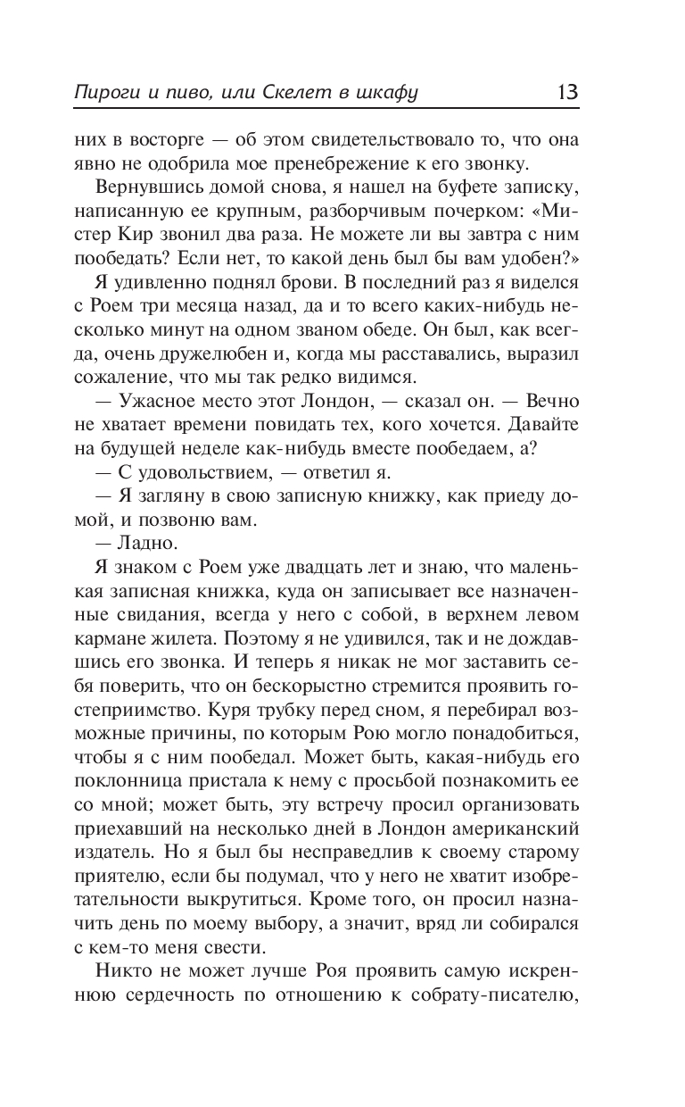 В центре повествования романа "Пироги и пиво, или Скелет в шкафу" – судьба знаменитого английского писателя Эдуарда Дриффилда, чей творческий путь был противоречив и тернист. На заре карьеры он слыл безыскусным реалистом, которого презирал весь город и отвергала литературная среда, а в конце жизни стал признанным классиком. Доказывает ли это, что писатель – не просто профессия, а особый образ мыслей и действий?