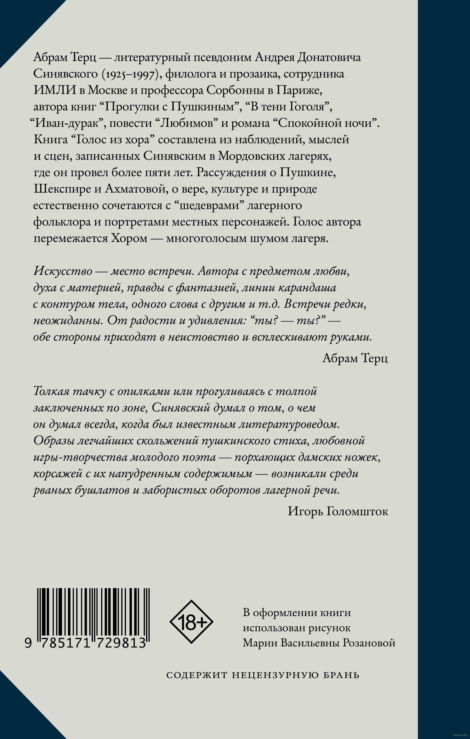 Книга "Голос из хора" составлена из наблюдений, мыслей и сцен, записанных Синявским в Мордовских лагерях, где он провел более пяти лет. Рассуждения о Пушкине, Шекспире и Ахматовой, о вере, культуре и природе естественно сочетаются с "шедеврами" лагерного фольклора и портретами местных персонажей. Голос автора перемежается Хором – многоголосым шумом лагеря.
