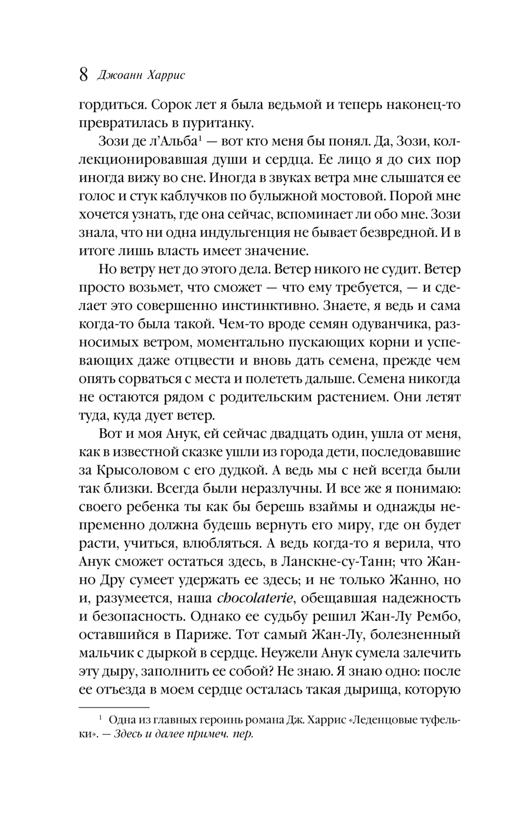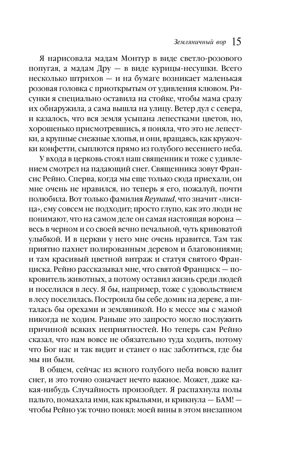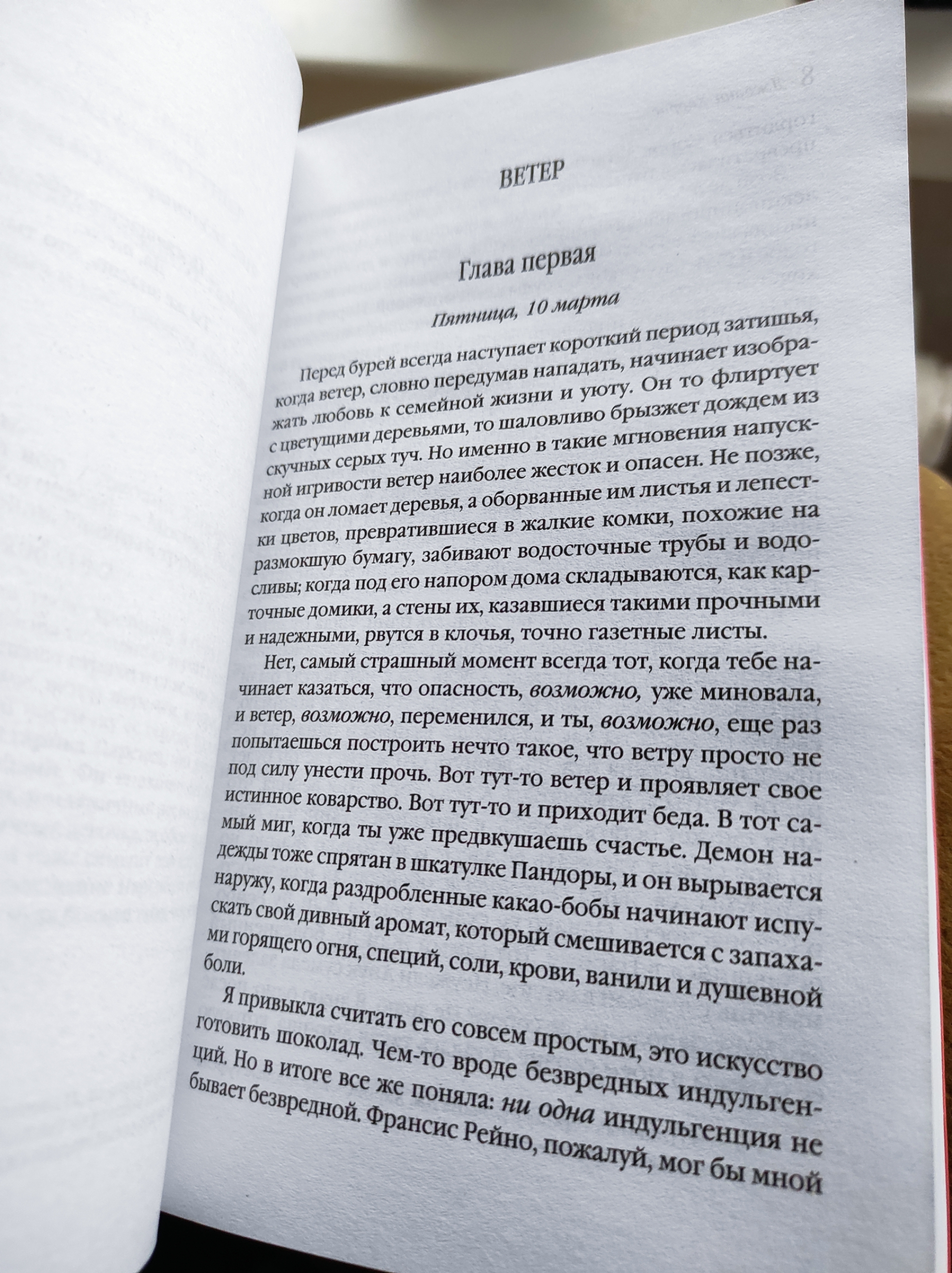 "Кошка пересекла твою тропинку в снегу и замяукала. Дул Хуракан" – эти слова постоянно звучат в голове Вианн Роше, которую одолевают страхи и опасения. В сонный городок Ланскне пришел ветер перемен, который, кажется, вот-вот унесет с собой частичку ее сердца. Все началось со смерти нелюдимого старика Нарсиса, что держал на площади цветочный магазин. Он внезапно оставил Розетт, младшей дочери Вианн, земляничный лес на границе своих угодий. Розетт – необычная девочка, особенная, говорит на птичьем языке, рисует и тоже слышит зов ветра. Уж она-то сохранит лес. Однако завещание Нарсиса и его наследие, как оказалось, скрывает куда больше тайн, чем можно было предположить.