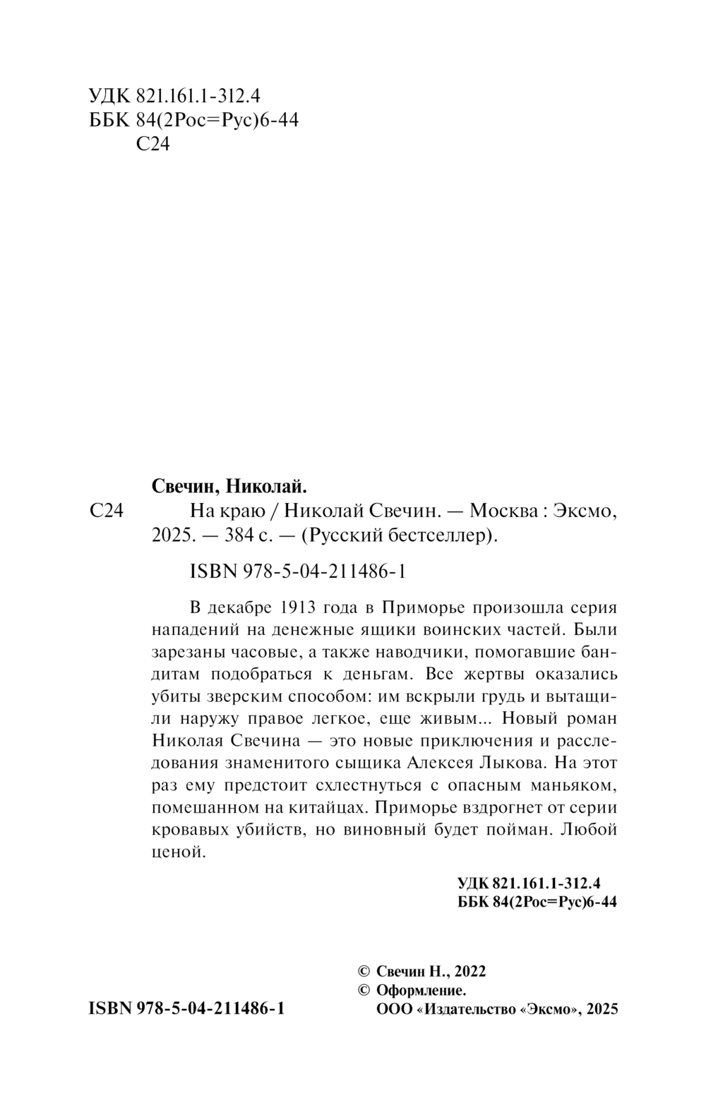 Новый роман Николая Свечина – это новые приключения и расследования знаменитого сыщика Алексея Лыкова. На этот раз ему предстоит схлестнуться с опасным маньяком, помешанном на китайцах. Приморье вздрогнет от серии кровавых убийств, но виновный будет пойман. Любой ценой.
