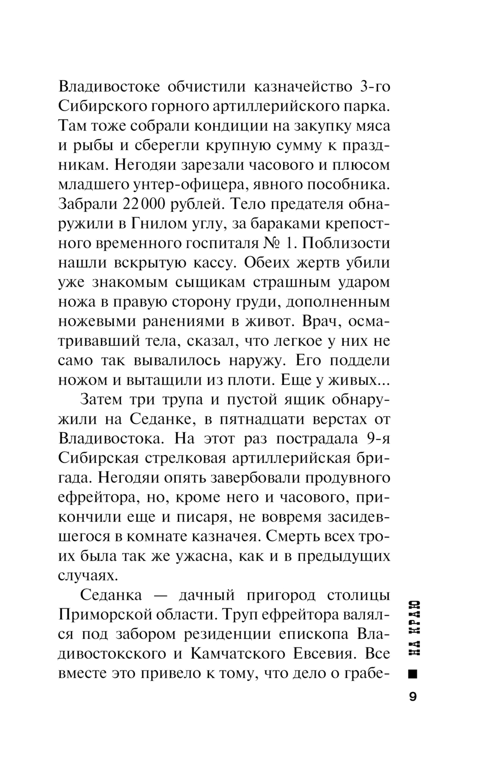 В декабре 1913 года в Приморье произошла серия нападений на денежные ящики воинских частей. Были зарезаны часовые, а также наводчики, помогавшие бандитам подобраться к деньгам. Все жертвы оказались убиты зверским способом: им вскрыли грудь и вытащили наружу правое легкое, еще живым...