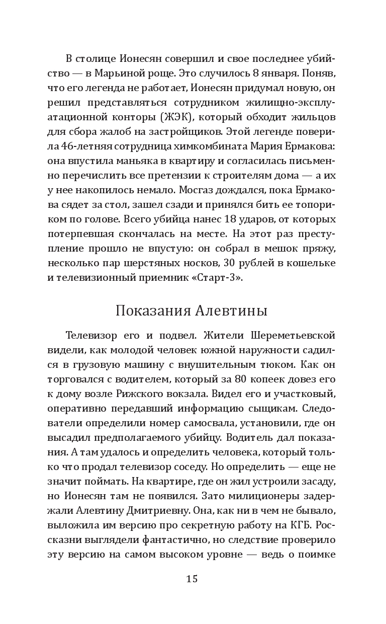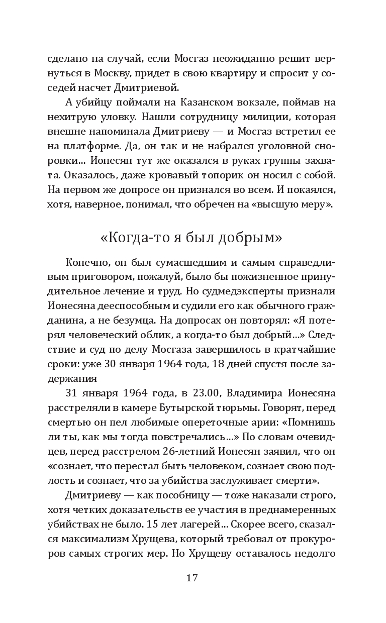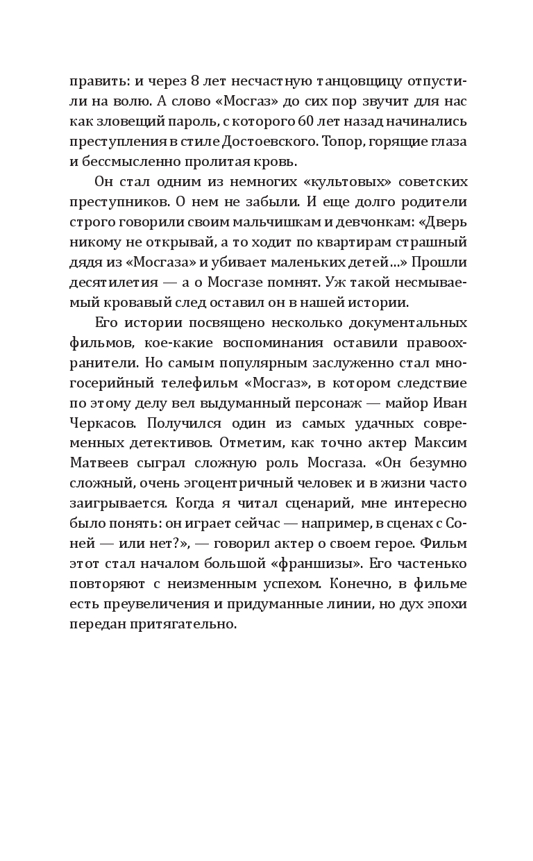 В 1960-е годы он наводил ужас на Москву, о нем со страхом говорил весь Союз, добавляя к скупой правде цветастые легенды. А сейчас пришло время познакомиться с истинной историей "Мосгаза" – самого знаменитого советского серийного убийцы, заставившего Уголовный розыск изменить подходы к работе и выработать новые методы поимки преступника. Историю "Мосгаза" автор дополнил другими легендарными сюжетами из практики Уголовного розыска, открывая нам пугающие стороны советской эпохи. Что может быть интереснее, чем ретро-преступления, жестокие, порой зверские, но овеянные ностальгической дымкой?