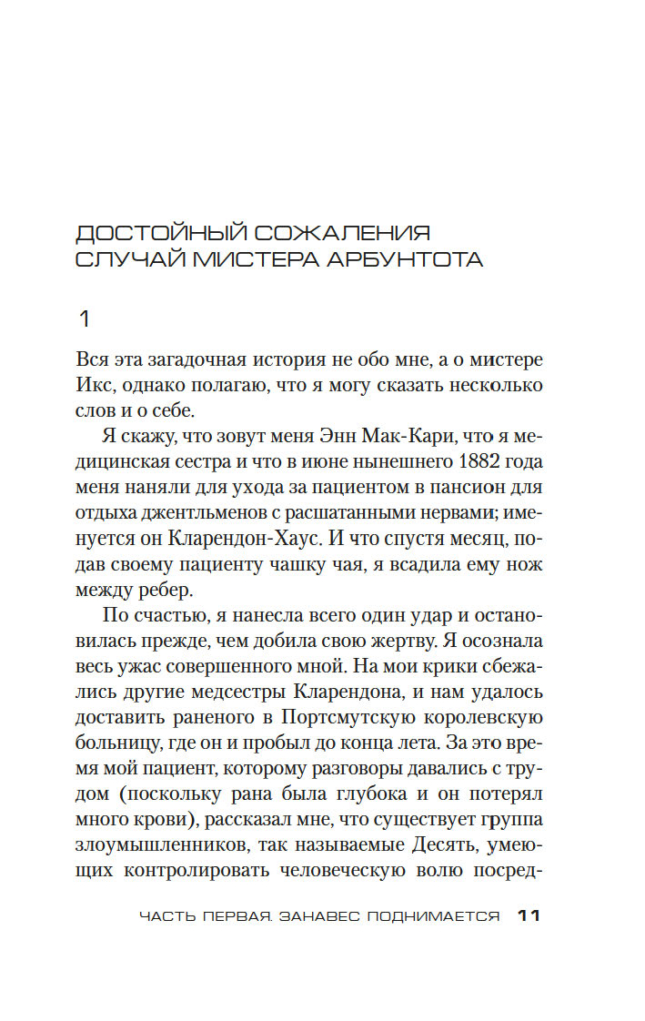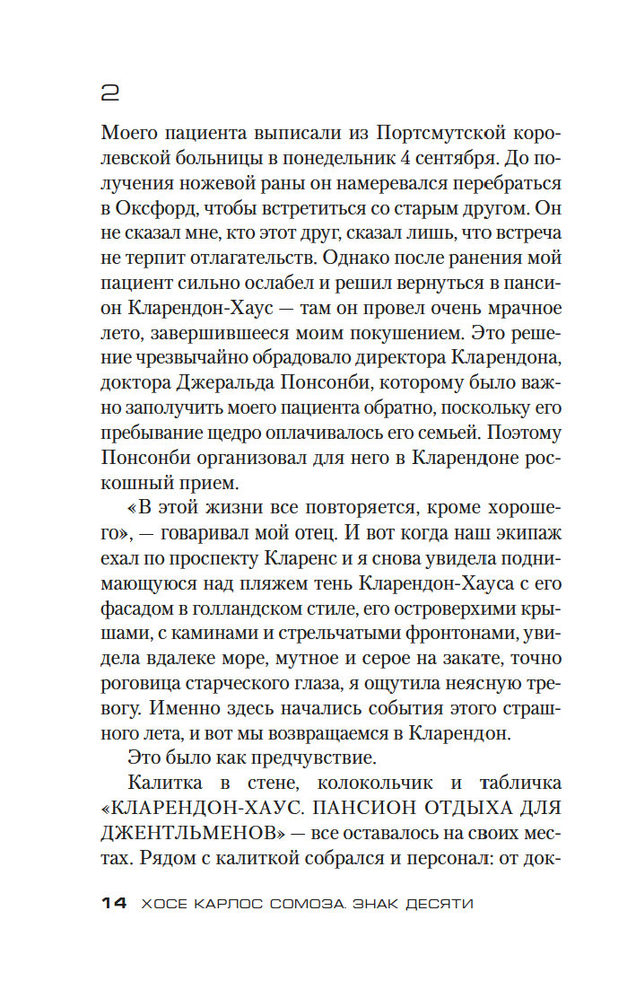 Хосе Карлос Сомоза – блистательный испанский писатель, чьи романы переведены на несколько десятков языков, лауреат премии "Золотой кинжал" и обладатель множества других литературных наград, создатель многослойных миров, где творятся очень страшные дела, автор фантастических, философских, исторических триллеров и хорроров. В "Знаке Десяти", продолжении "Этюда в черных тонах", возвращаются инфернально проницательный мистер Икс и его верная, ироничная, сильная и чувствительная медсестра Энн Мак-Кари, а вместе с ними в непредсказуемой интриге замешаны актеры, бутафоры и зрители жестоких подпольных театров, известные психиатры и, разумеется, Артур Конан Дойл.