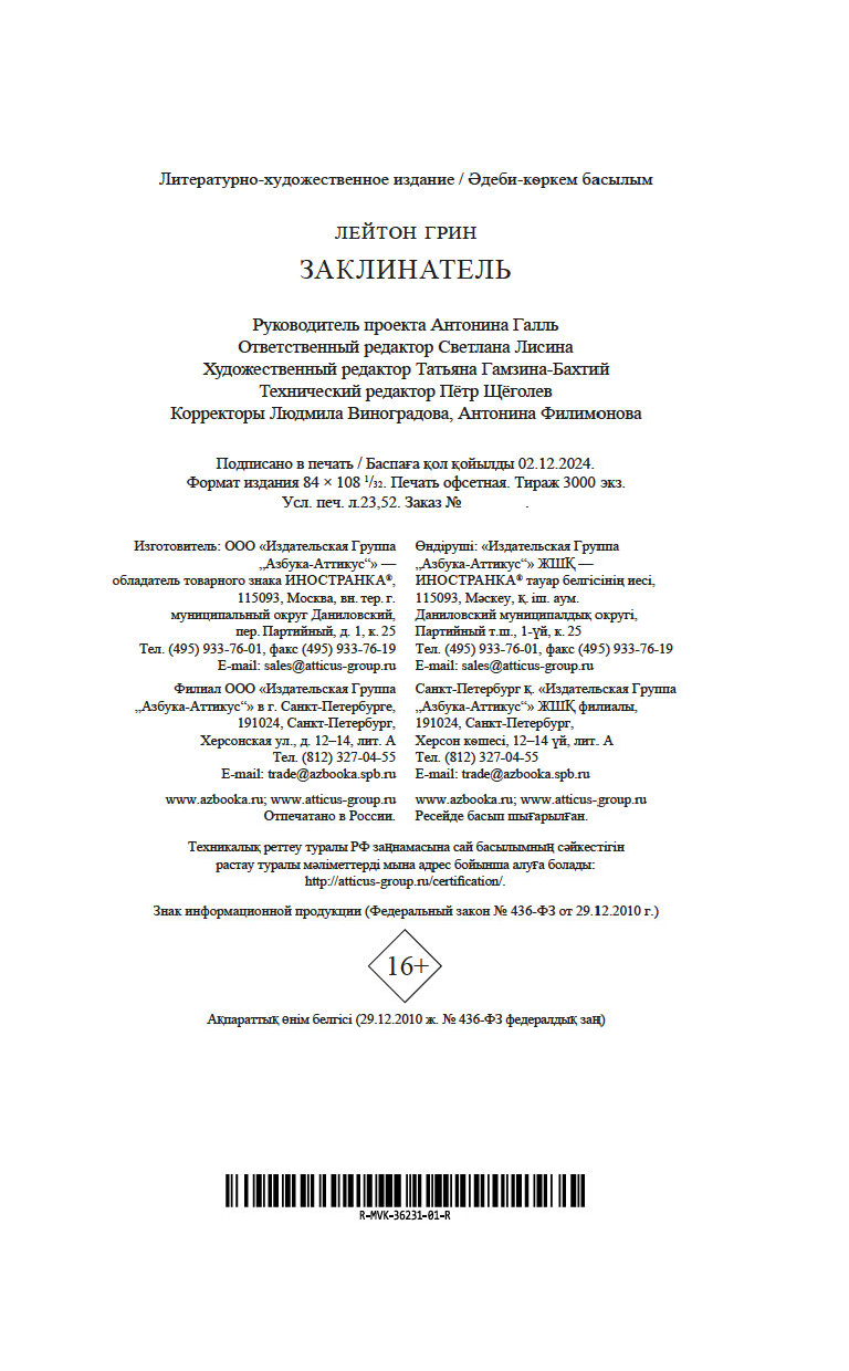 | Изготовитель | ООО "Издательство "Иностранка". 109017, РФ, г. Москва, ул. Пятницкая, 41 |