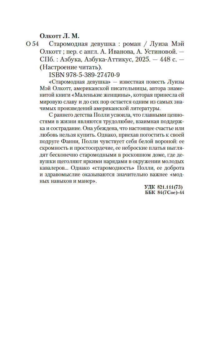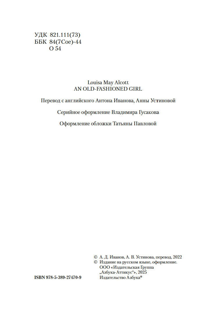 "Старомодная девушка" – известная повесть Луизы Мэй Олкотт, американской писательницы, автора знаменитой книги "Маленькие женщины", которая принесла ей мировую славу и до сих пор остается одним из самых значимых произведений американской литературы.
