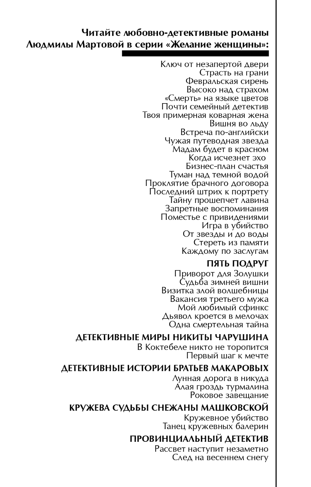 | Серия | Желание женщины. Детективные романы Л. Мартовой |