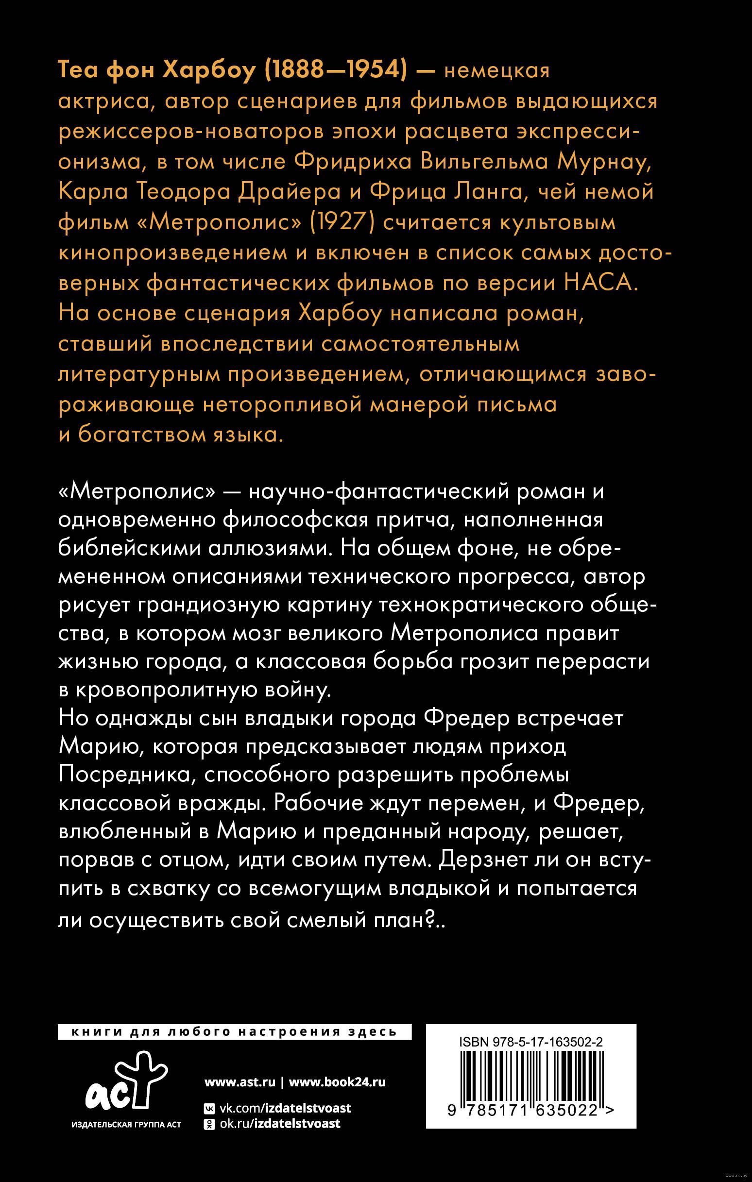 "Метрополис" – научно-фантастический роман и одновременно философская притча, наполненная библейскими аллюзиями. На общем фоне, не обремененном описаниями технического прогресса, автор рисует грандиозную картину технократического общества, в котором мозг великого Метрополиса правит жизнью города, а классовая борьба грозит перерасти в кровопролитную войну.