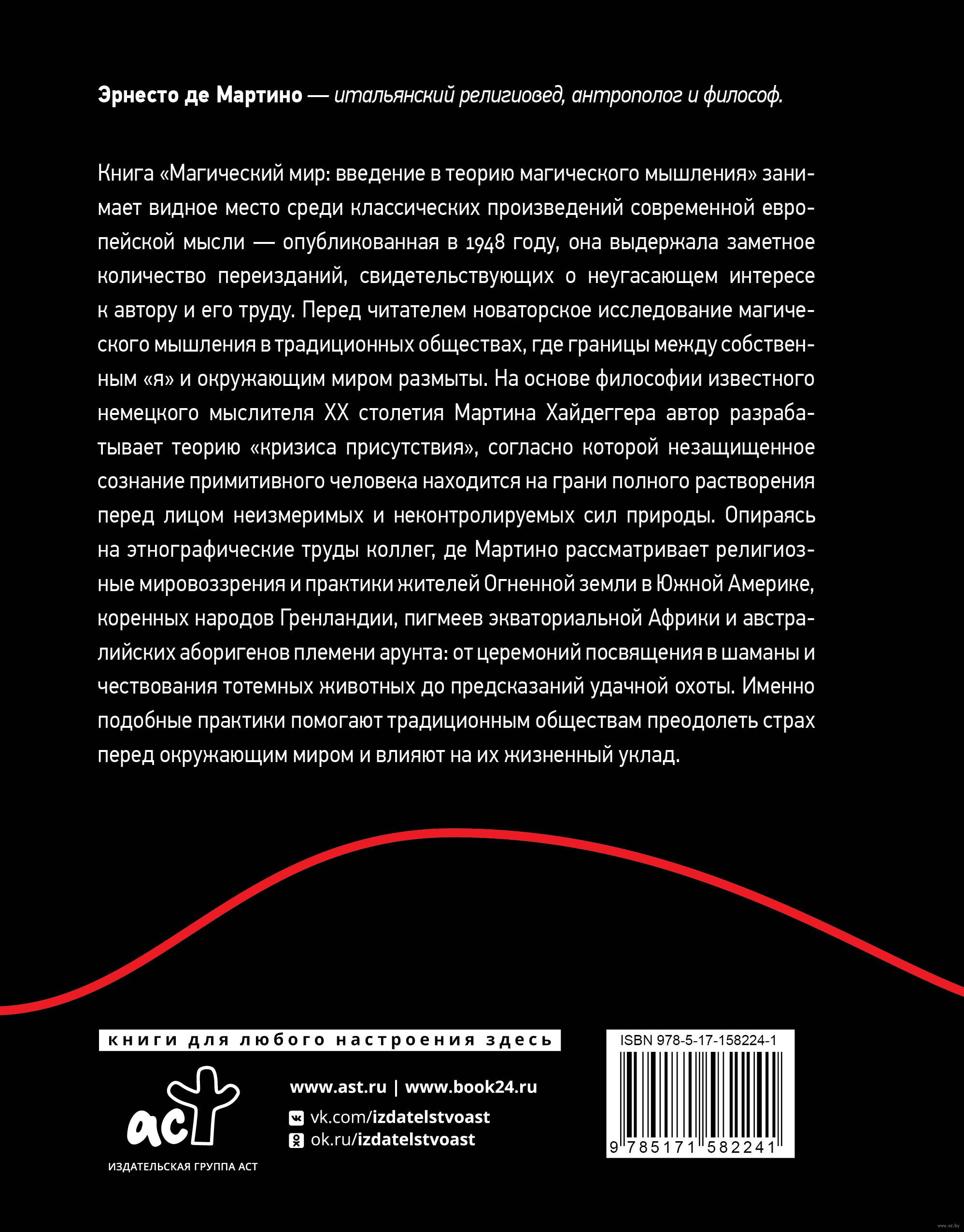 Перед читателем новаторское исследование магического мышления в традиционных обществах, где границы между собственным "я" и окружающим миром размыты. На основе философии известного немецкого мыслителя XX столетия Мартина Хайдеггера автор разрабатывает теорию "кризиса присутствия", согласно которой незащищенное сознание примитивного человека находится на грани полного растворения перед лицом неизмеримых и неконтролируемых сил природы. Опираясь на этнографические труды коллег, де Мартино рассматривает религиозные мировоззрения и практики жителей Огненной земли в Южной Америке, коренных народов Гренландии, пигмеев экваториальной Африки и австралийских аборигенов племени арунта: от церемоний посвящения в шаманы и чествования тотемных животных до предсказаний удачной охоты. Именно подобные практики помогают традиционным обществам преодолеть страх перед окружающим миром и влияют на их жизненный уклад.