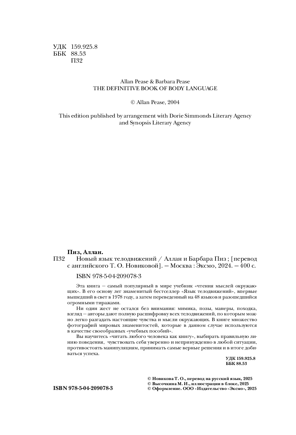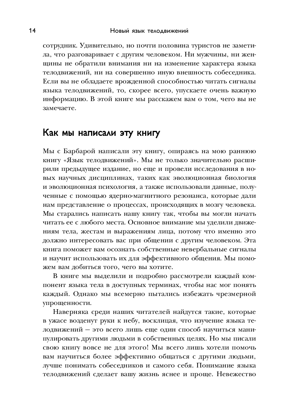 Эта книга – самый популярный в мире и авторитетный учебник "чтения мыслей окружающих по их жестам". В ее основу лег знаменитый бестселлер "Язык телодвижений", впервые вышедший свет в 1978 году, а затем переведенный на 48 языков и разошедшийся огромными тиражами: общее количество проданных экземпляров превысило 20 миллионов.