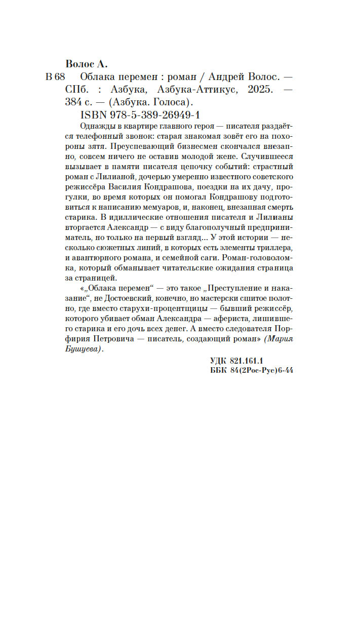 "„Облака перемен" – это такое „Преступление и наказание", не Достоевский, конечно, но мастерски сшитое полотно, где вместо старухи-процентщицы – бывший режиссёр, которого убивает обман Александра – афериста, лишившего старика и его дочь всех денег. А вместо следователя Порфирия Петровича – писатель, создающий роман" (Мария Бушуева).