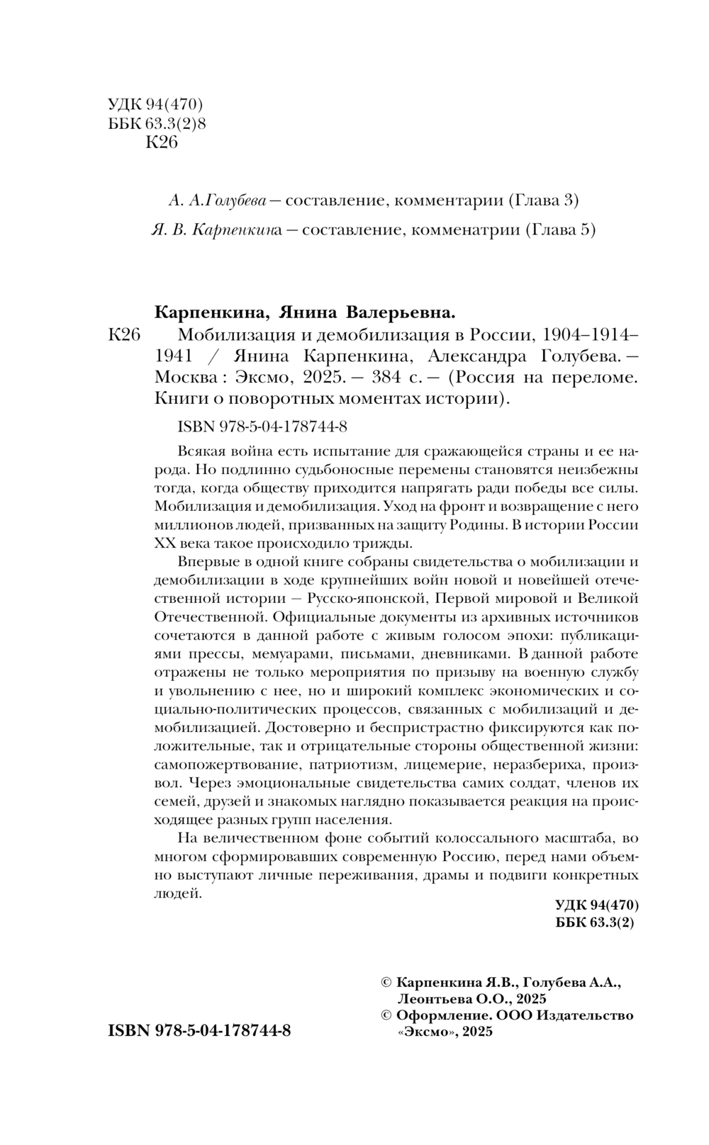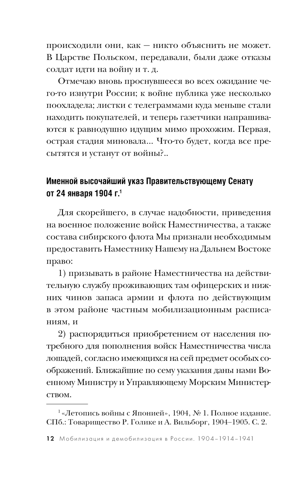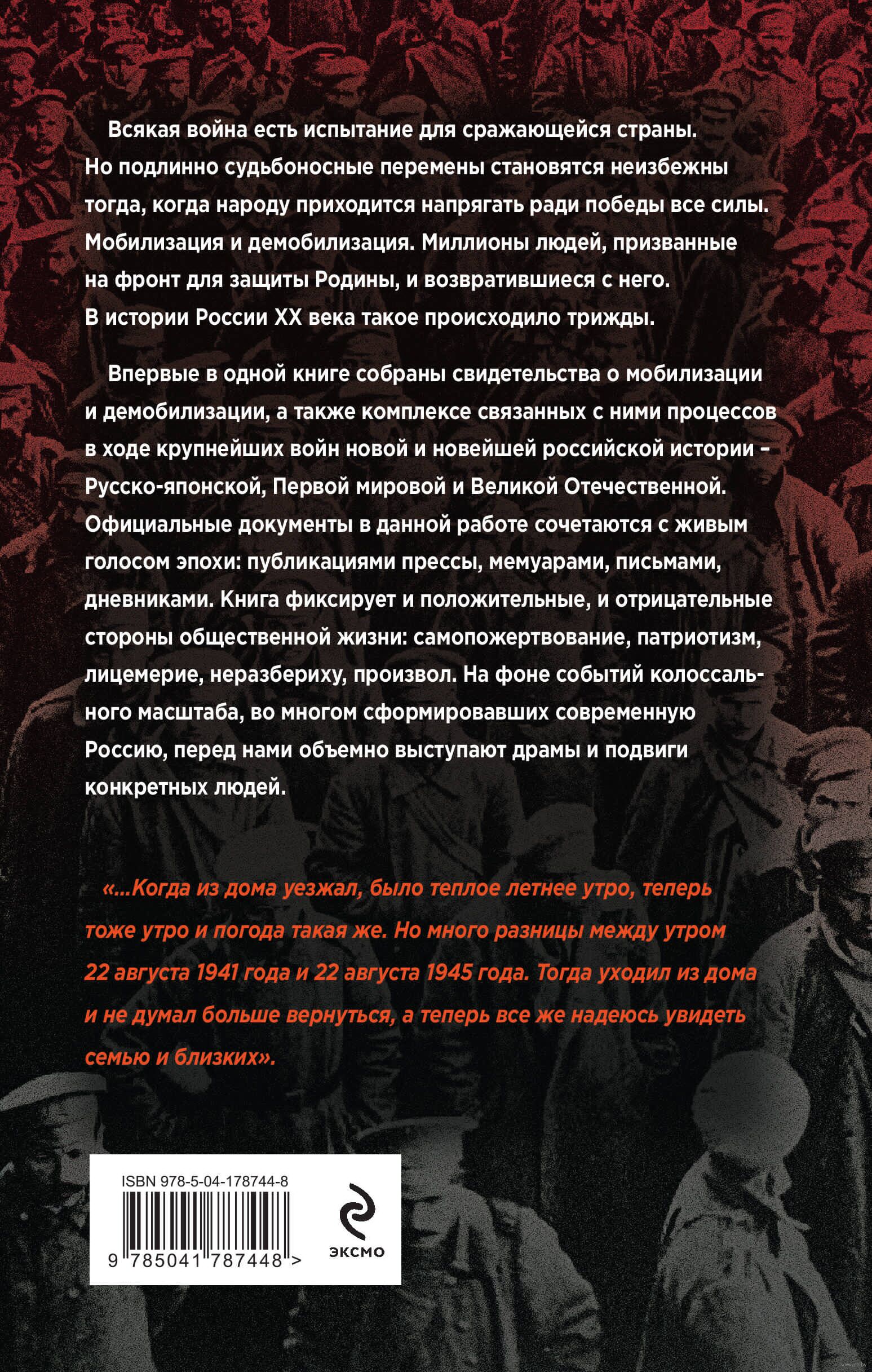 Впервые в одной книге собраны свидетельства о мобилизации и демобилизации в ходе крупнейших войн новой и новейшей отечественной истории – Русско-японской, Первой мировой и Великой Отечественной. Официальные документы из архивных источников сочетаются в данной работе с живым голосом эпохи: публикациями прессы, мемуарами, письмами, дневниками. В данной работе отражены не только мероприятия по призыву на военную службу и увольнению с нее, но и широкий комплекс экономических и социально-политических процессов, связанных с мобилизаций и демобилизацией. Достоверно и беспристрастно фиксируются как положительные, так и отрицательные стороны общественной жизни: самопожертвование, патриотизм, лицемерие, неразбериха, произвол. Через эмоциональные свидетельства самих солдат, членов их семей, друзей и знакомых наглядно показывается реакция на происходящее разных групп населения.
